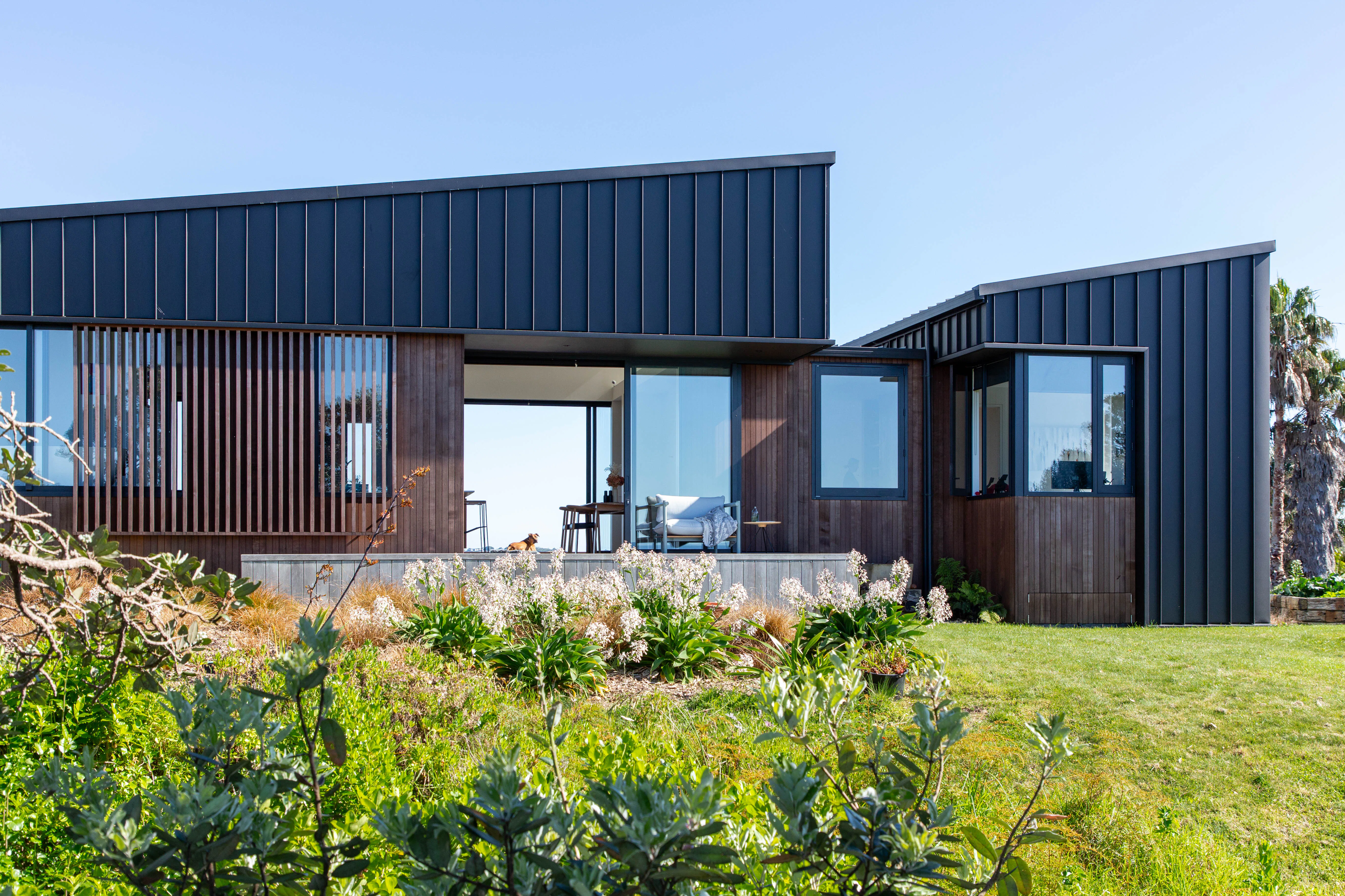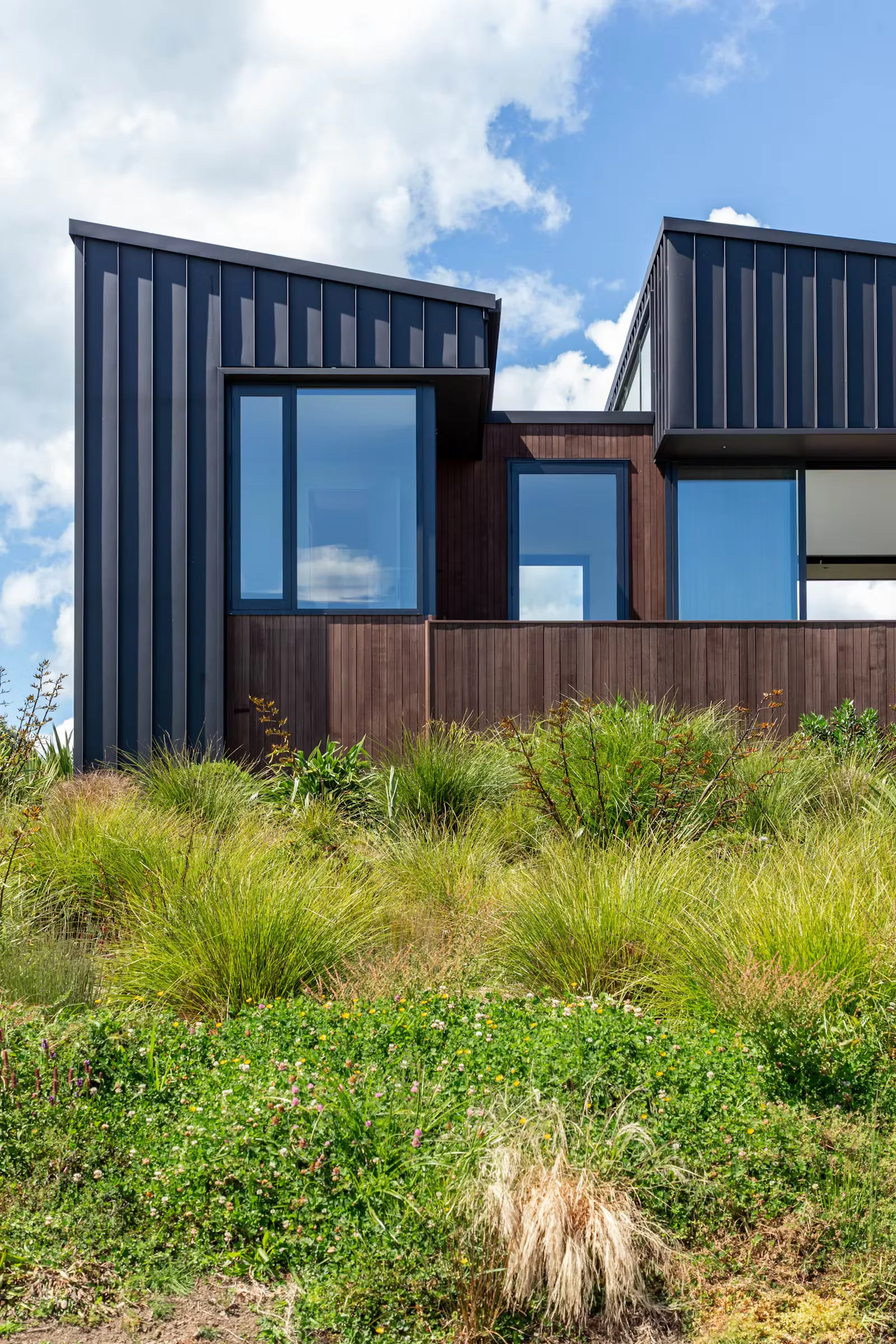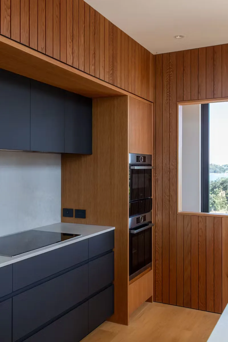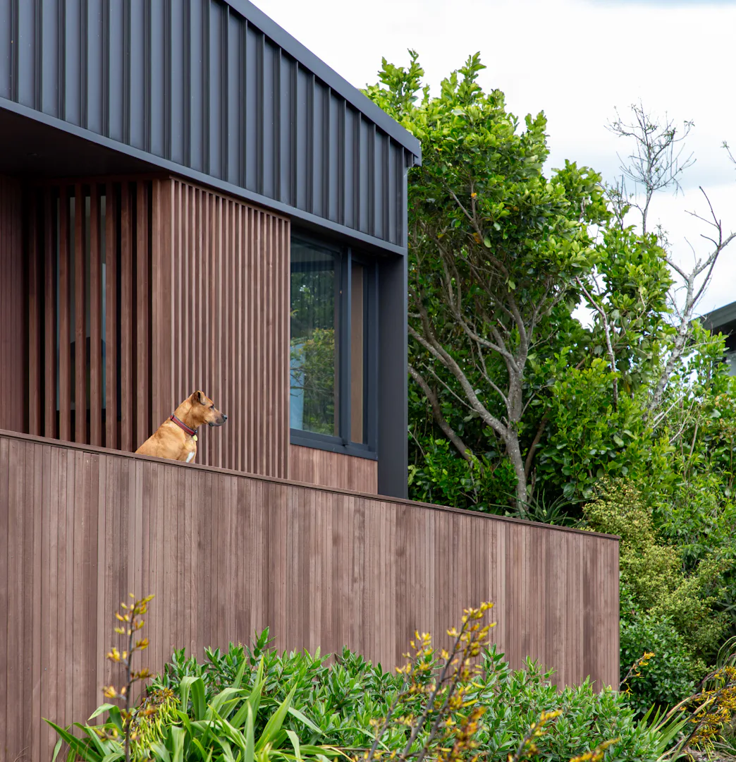The home has been imagined as a composition of silhouettes on the ridgeline. Dark toned materials and peaked roof forms enhance this notion when viewed from car ferries and watercraft passing the base of the cliff below. Mature Pohutukawa trees border the home when viewed from afar, while framing the distant vistas looking out.