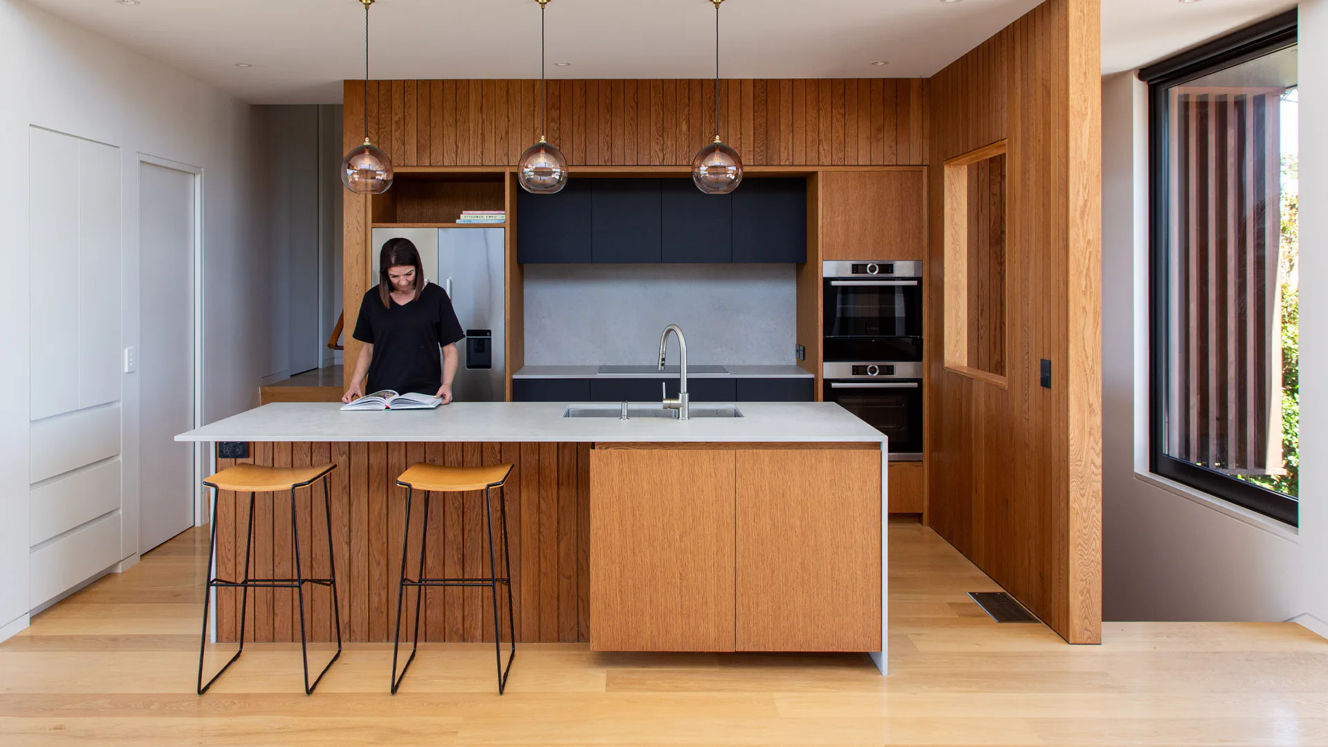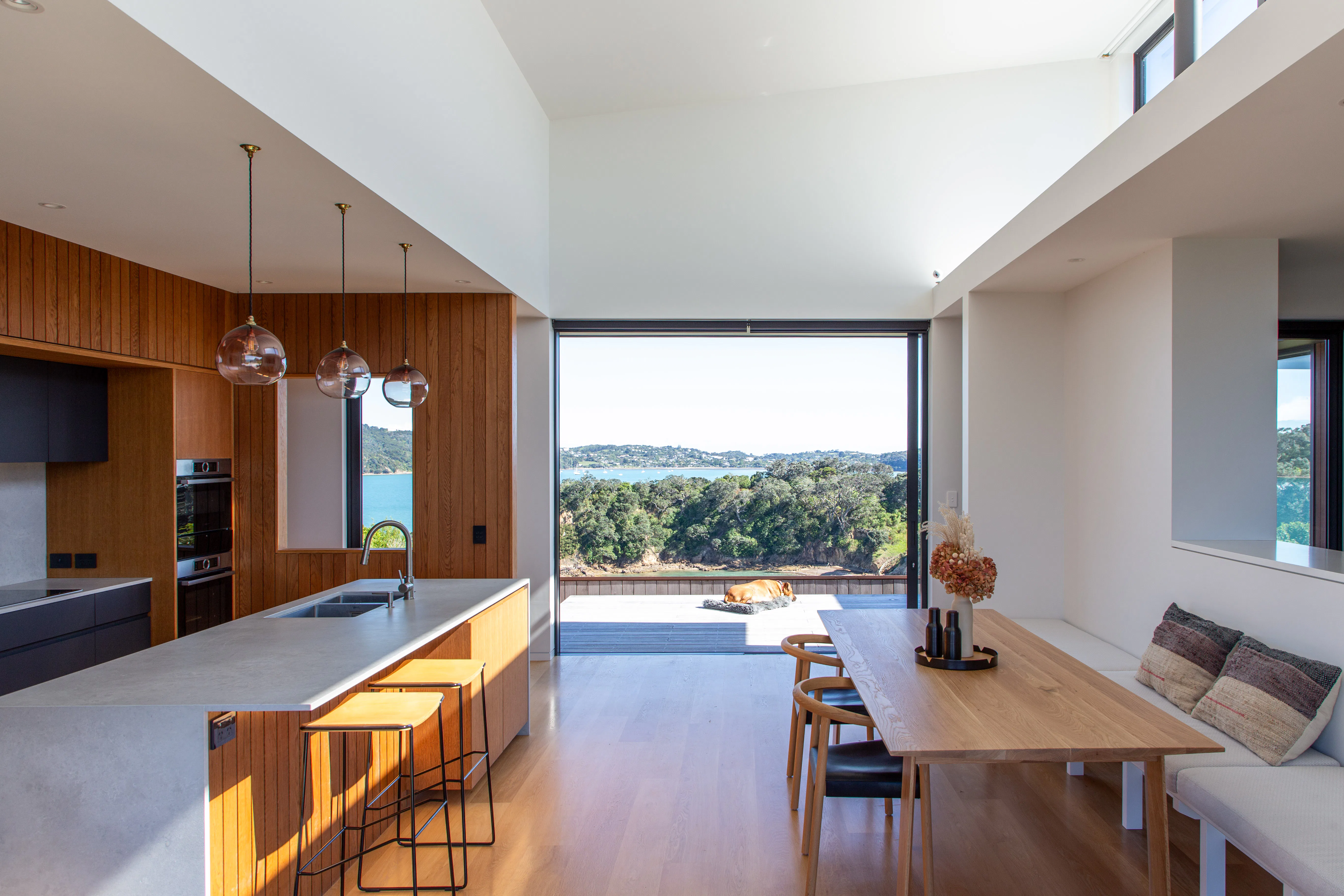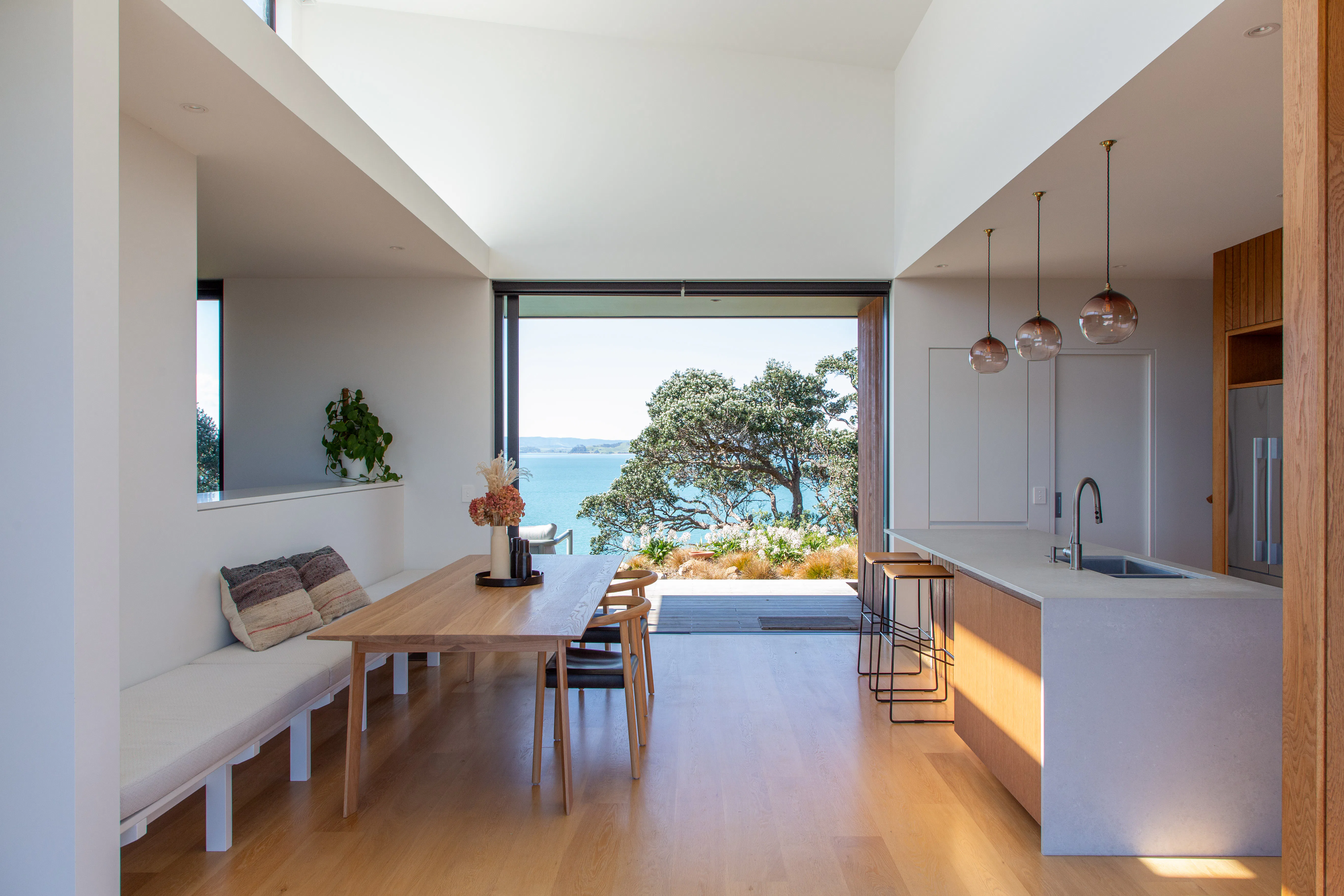 Three bedrooms, two bathrooms, a small garage and a single living space has allowed a relatively modest floor plan. Split level planning places the garage and entry low on the site, with the main bedroom suite elevated above. Living and guest spaces sit at a level between, connecting through the centre of the plan to both a windward and a leeward deck. Booth dining seating and low room dividers have been used to further increase spatial efficiency.