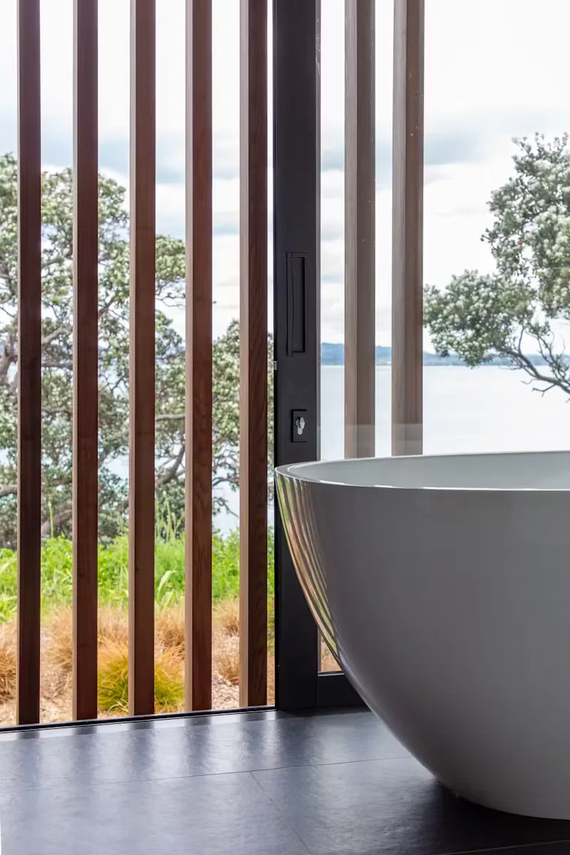 Located on an elevated Waiheke Island ridgeline this home benefits from wide elevated coastal views both to the north and to the south. With neighboring homes to the east and west, the home has been arranged with transparency through the centre which creates a breezeway with living areas through the heart of the home. Each side is “bookended” with bedrooms for privacy.