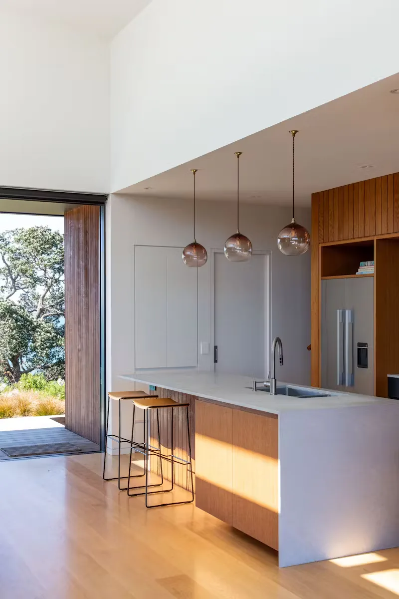 Lightweight timber construction has been employed for ease of freight to the island, reducing the use of structural steel and concrete, thus minimalising the release of carbon. A combination of trussed roofs with flat ceilings and raftered volumed spaces creates comfortable “held” spaces in bedrooms while allowing lofty light filled volumes in living spaces.