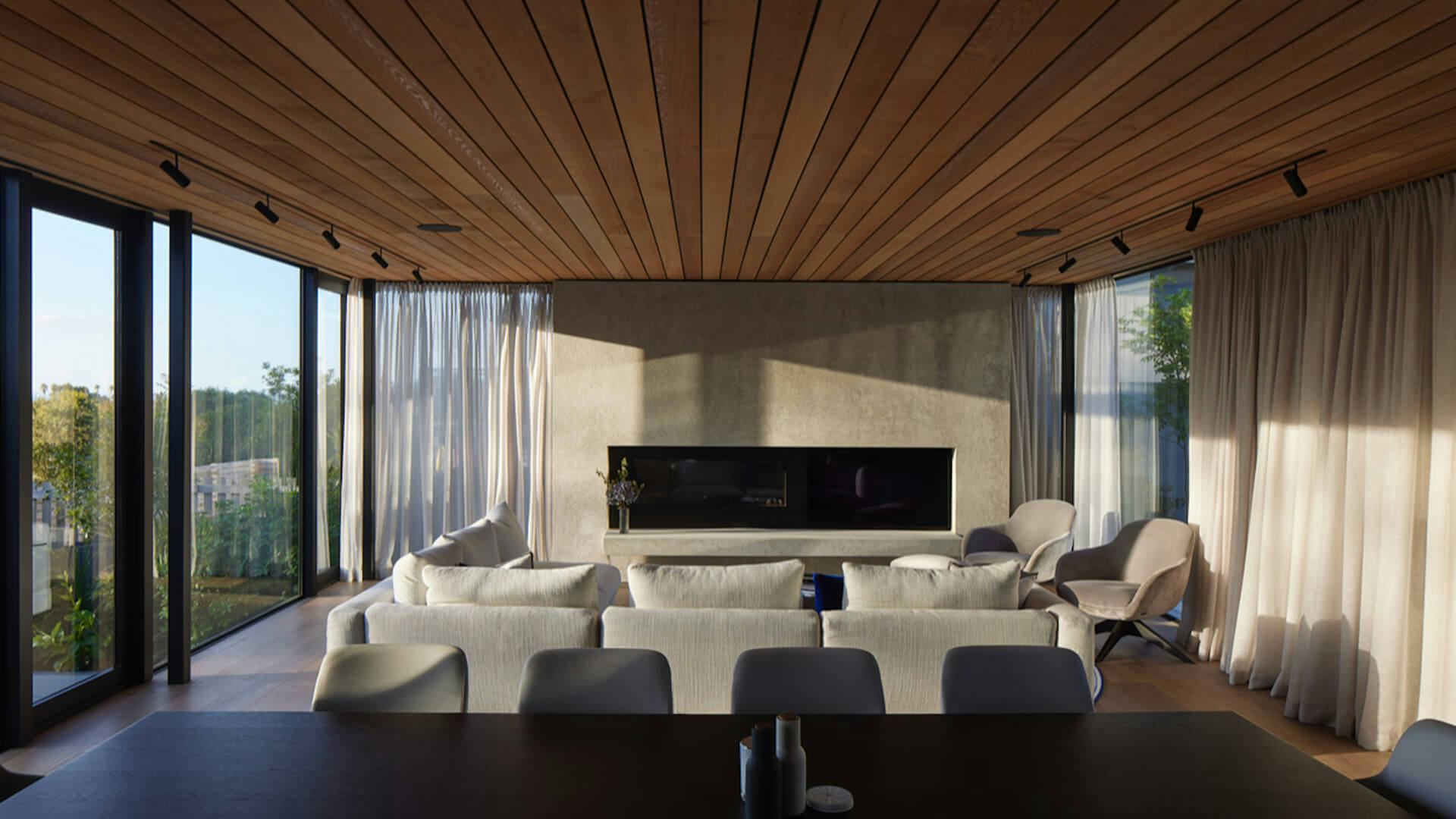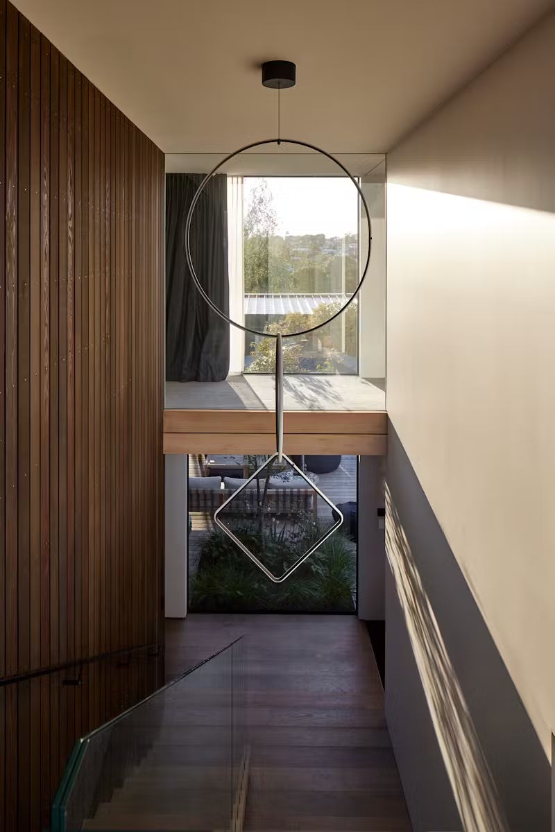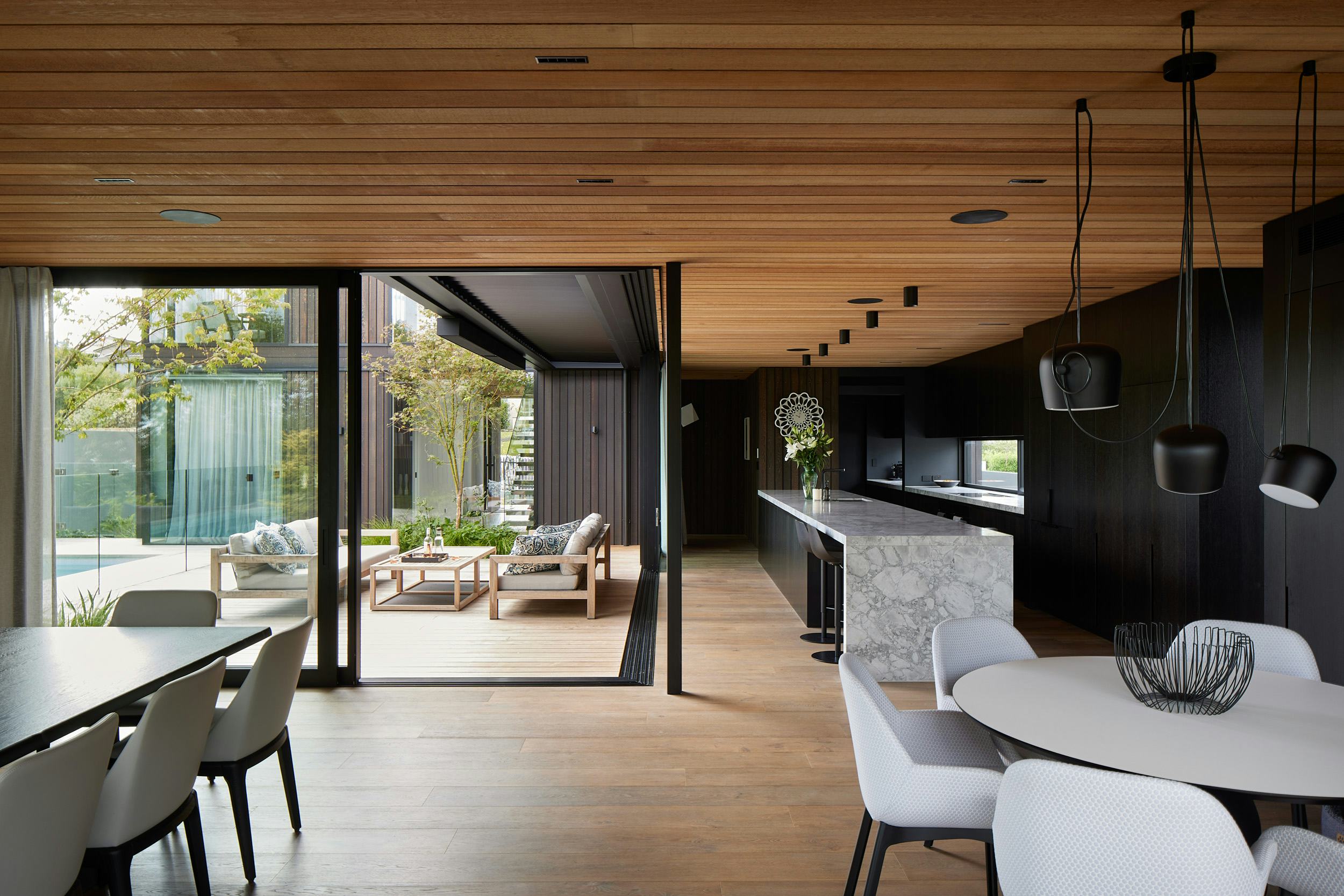 Stepping inside, visitors are greeted by a black cedar pivot door, a solid oak floating staircase and lush green lobby setting, framed with full height joinery to a private courtyard which leads you to the heart of the home.