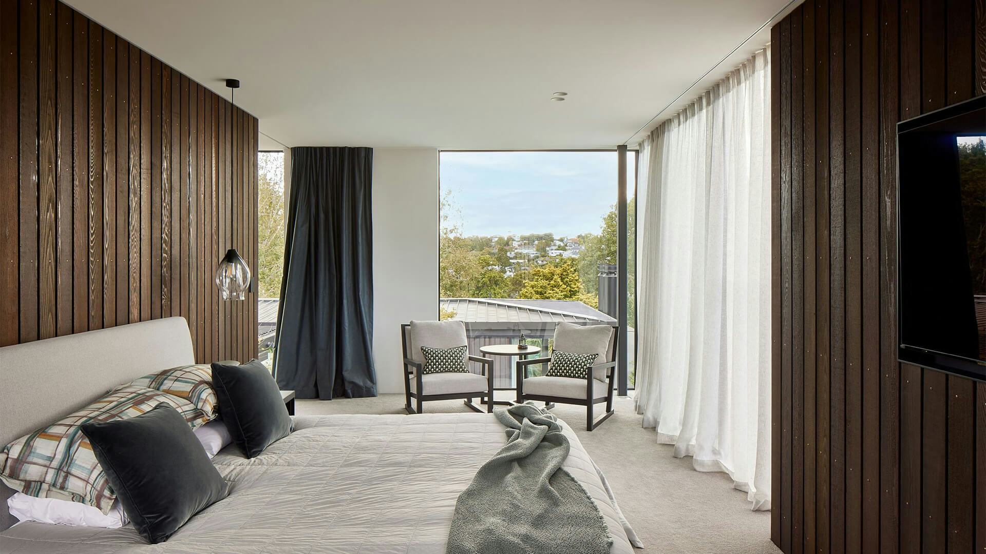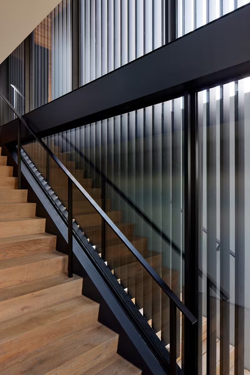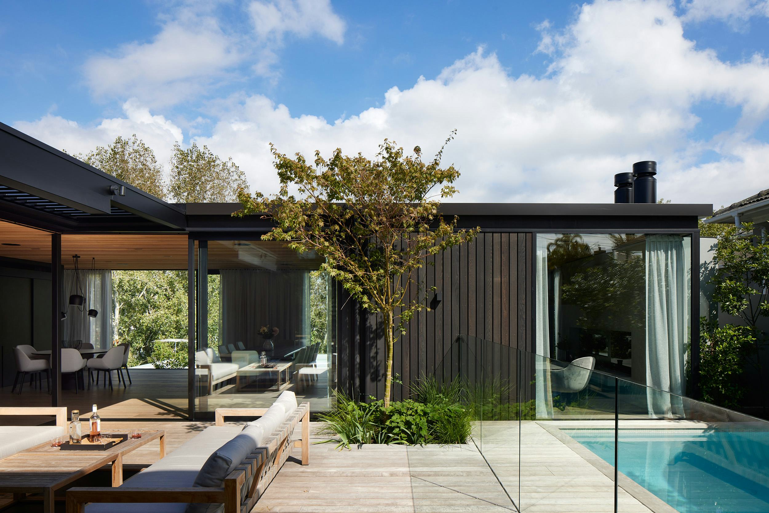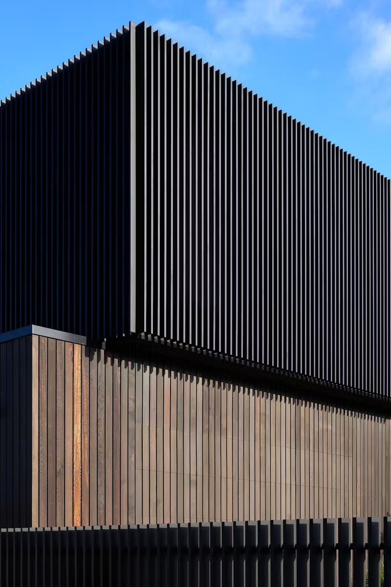 Sitting poised against Madills Reserve, the home’s exterior showcases tall black louvres and cedar cladding, offering passers by a glimpse of its elegance.