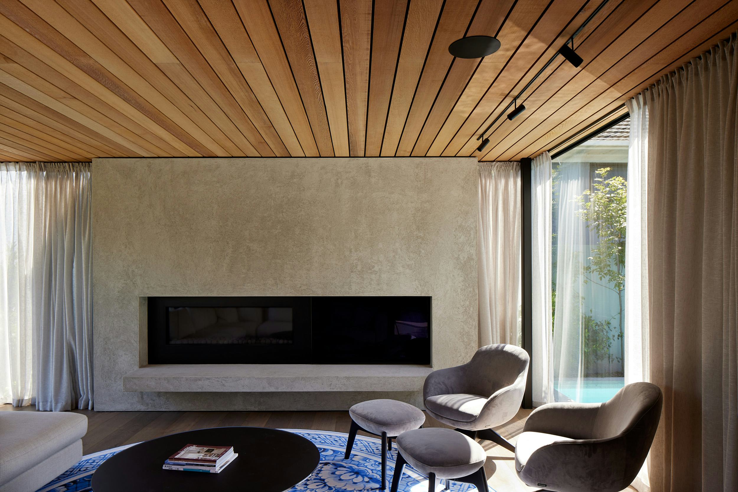 The living room boasts a textured, smoky grey plaster hearth, complemented by soft French grey timber floors and filtered sunlight cast through the precise jet black louvres.