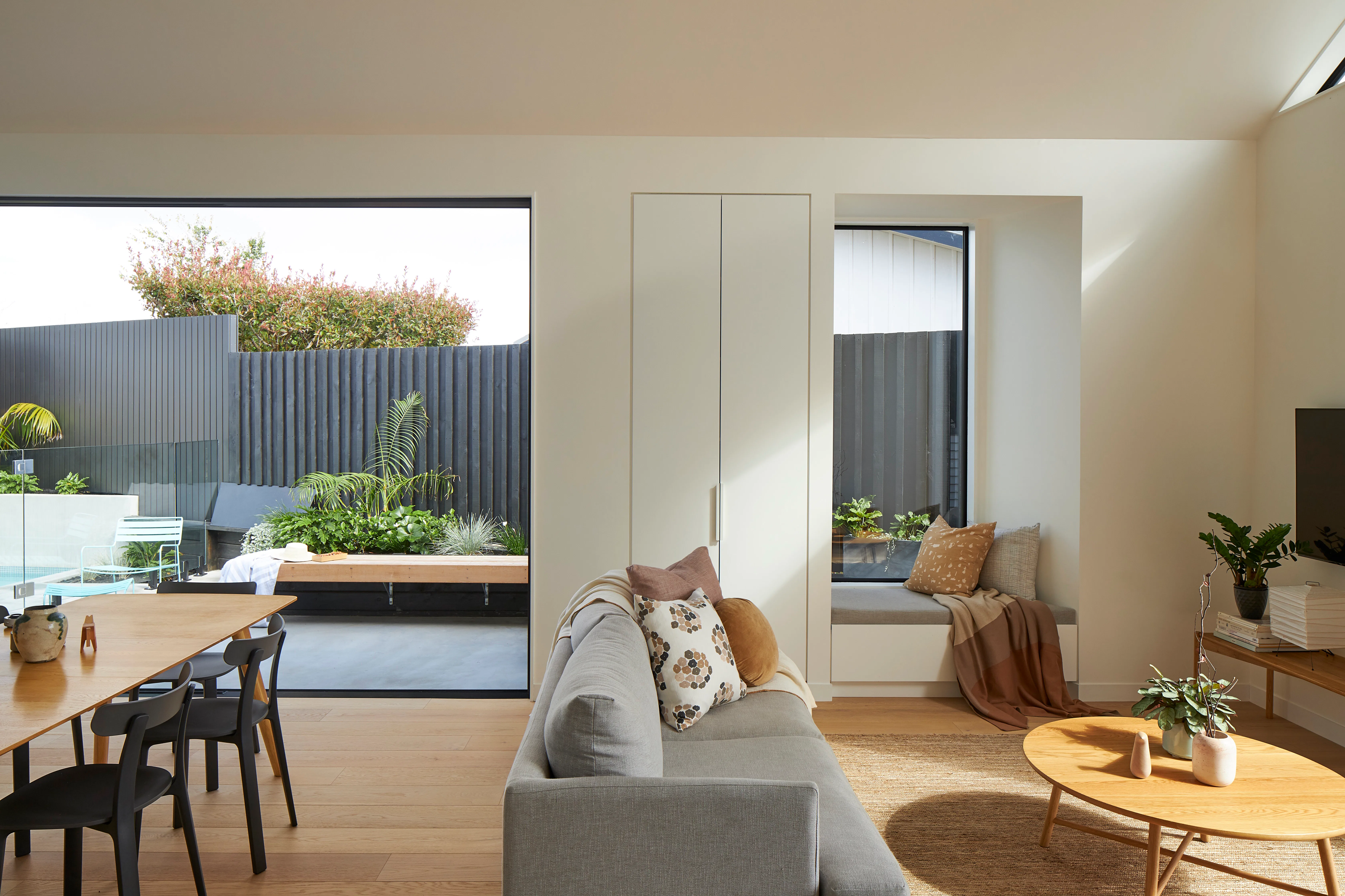 The combination of a high gable roof and extensive joinery designed to maximise light while ensuring privacy, means that the family are able to enjoy a sun soaked living area that flows naturally into their transformed outdoor living space, beautifully designed and installed by SGLA.