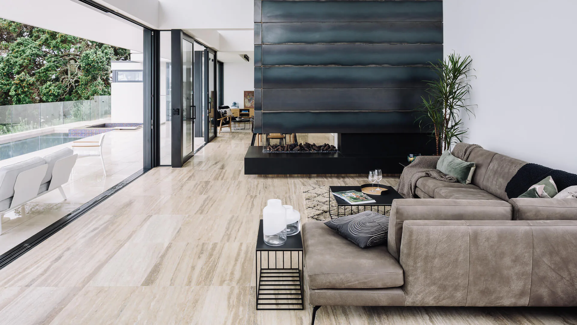 Like each project, we wanted Shoal Bay to radiate character. Stone flooring and a waxed steel fireplace were used to create an inviting atmosphere and entertainment spaces for guests to enjoy the amenities in full view of the raw natural beauty outside.