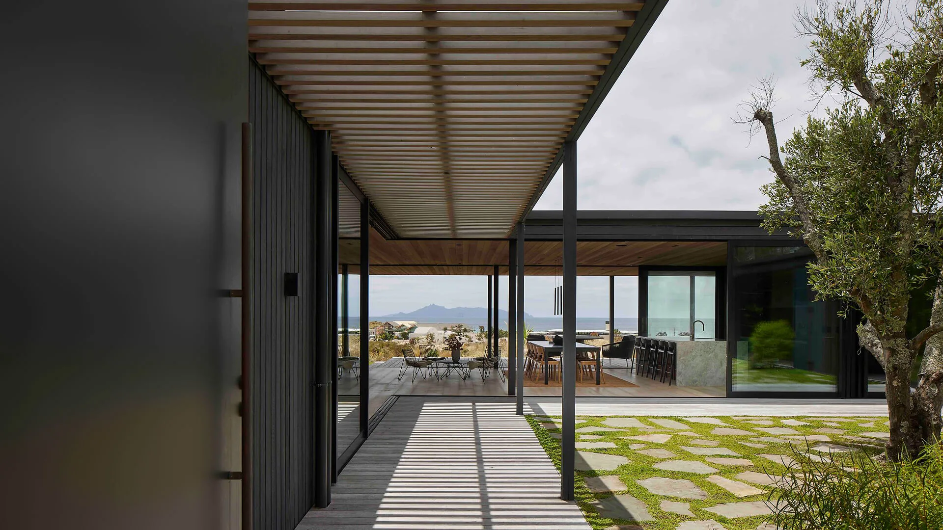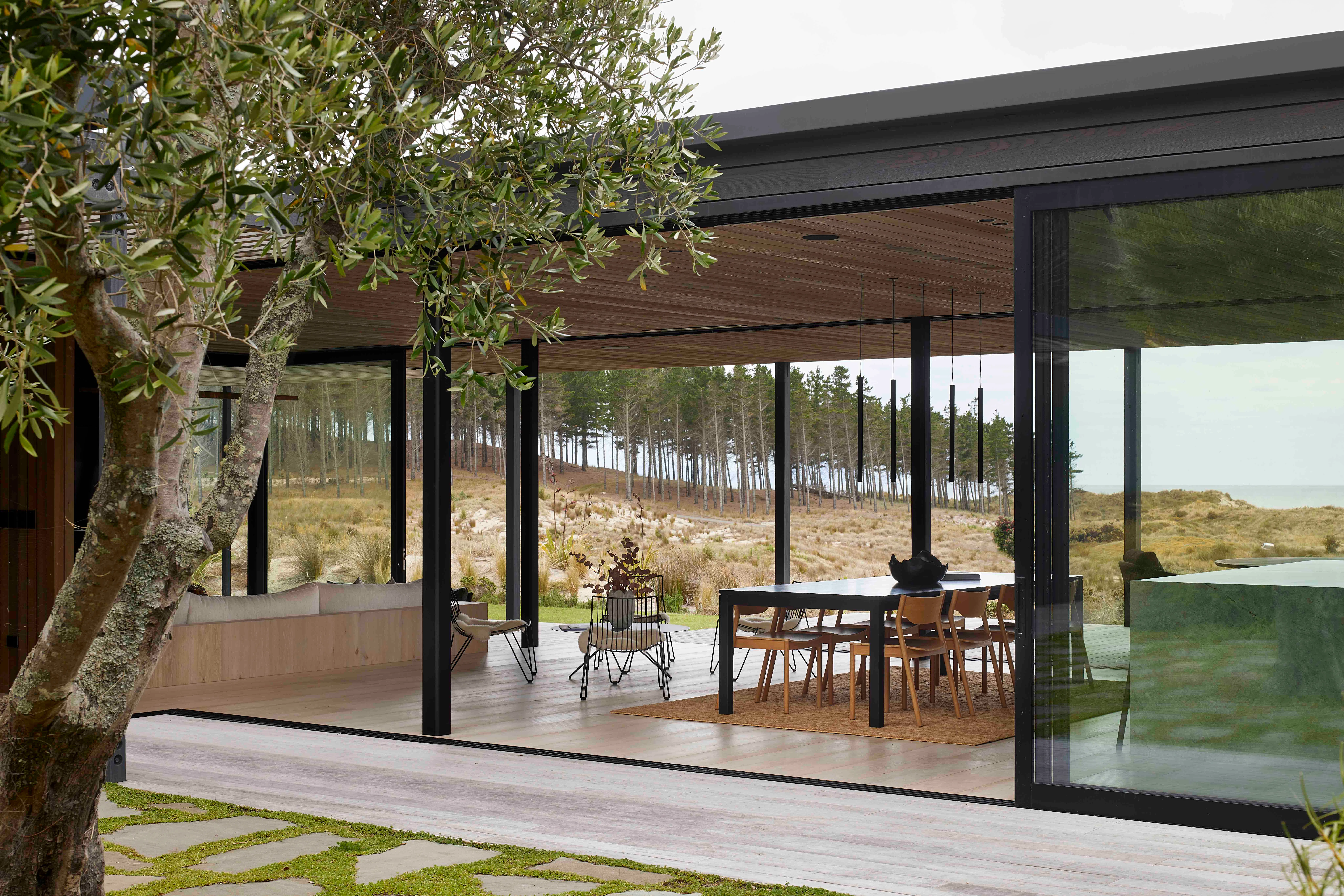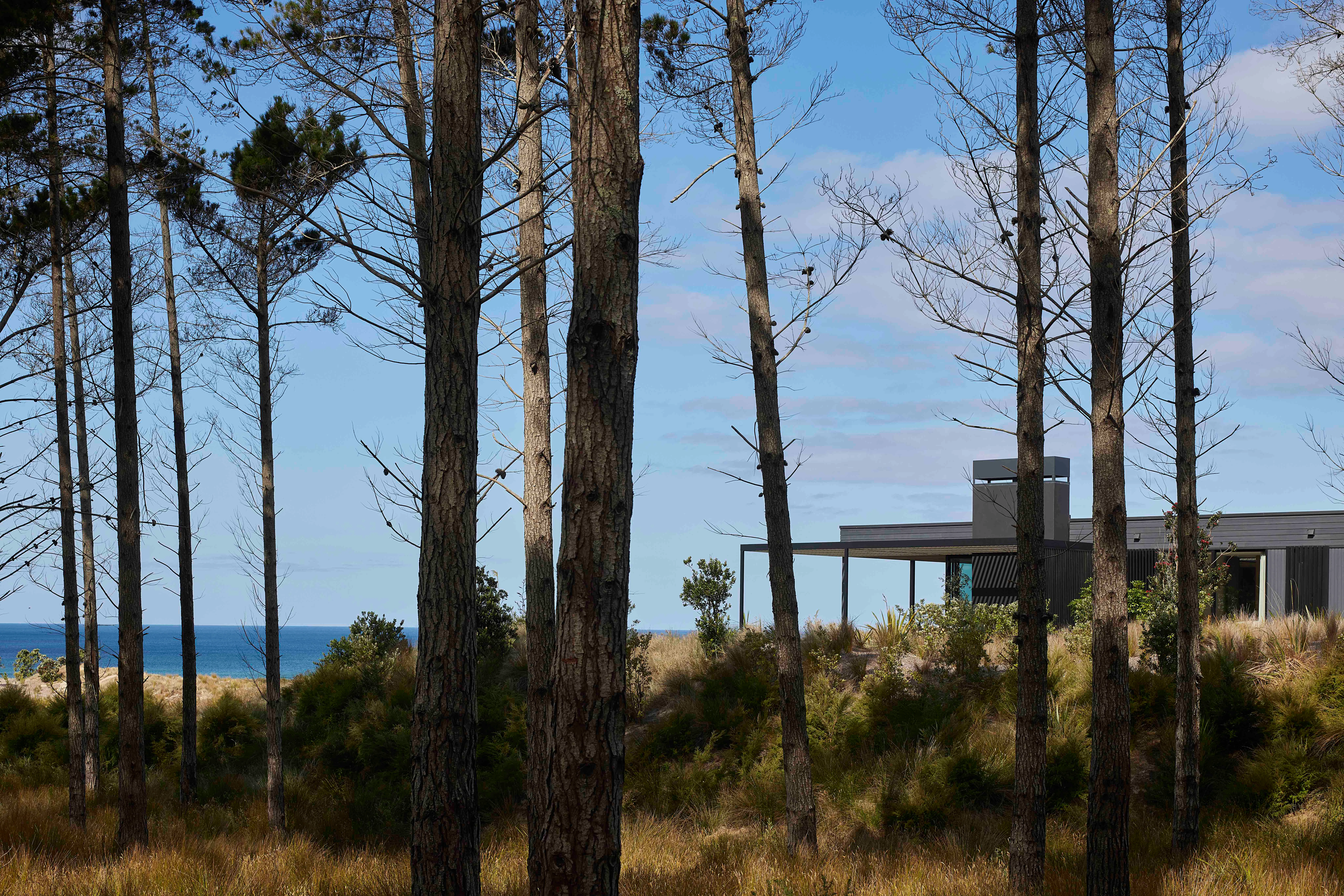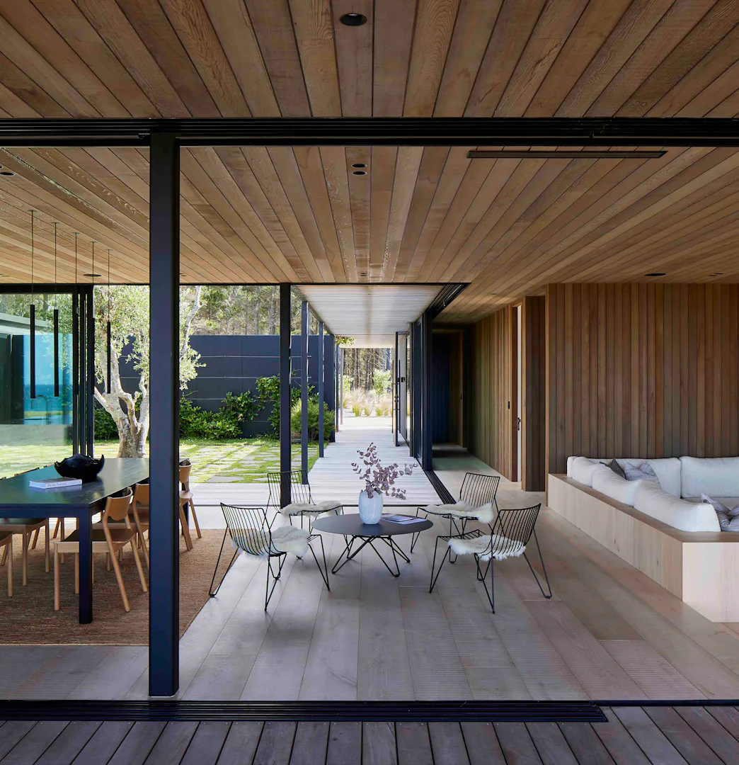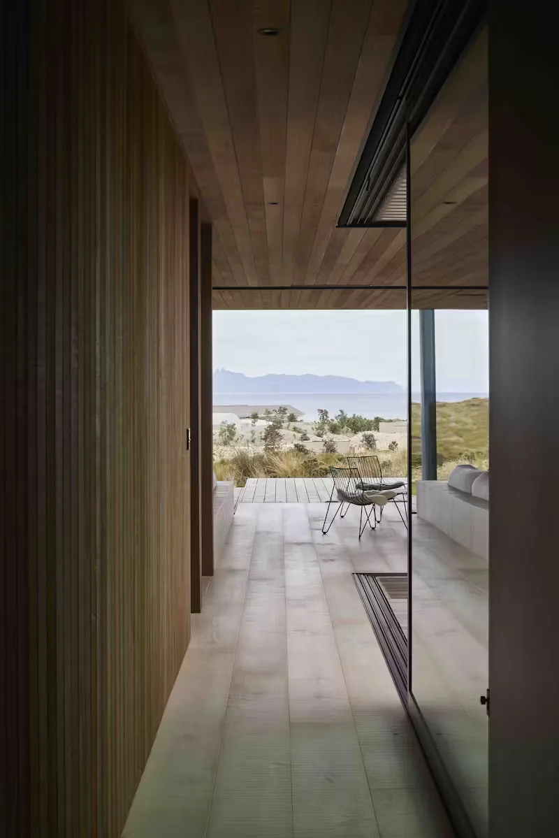 Situated at Te Arai overlooking the ocean, the home is built around a sheltered courtyard, the entrance gallery precisely centred on Sail rock.