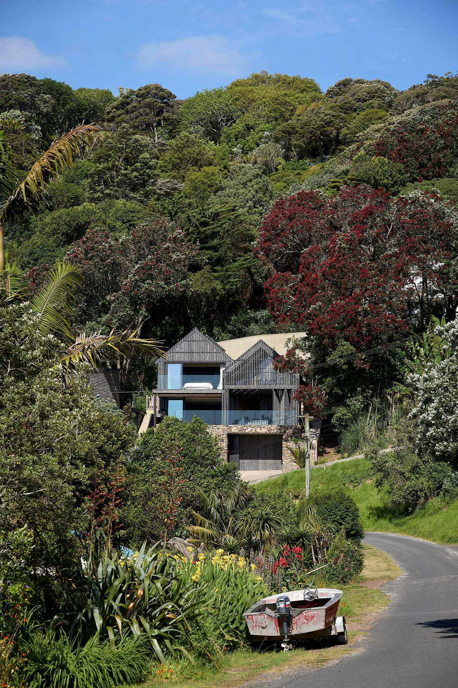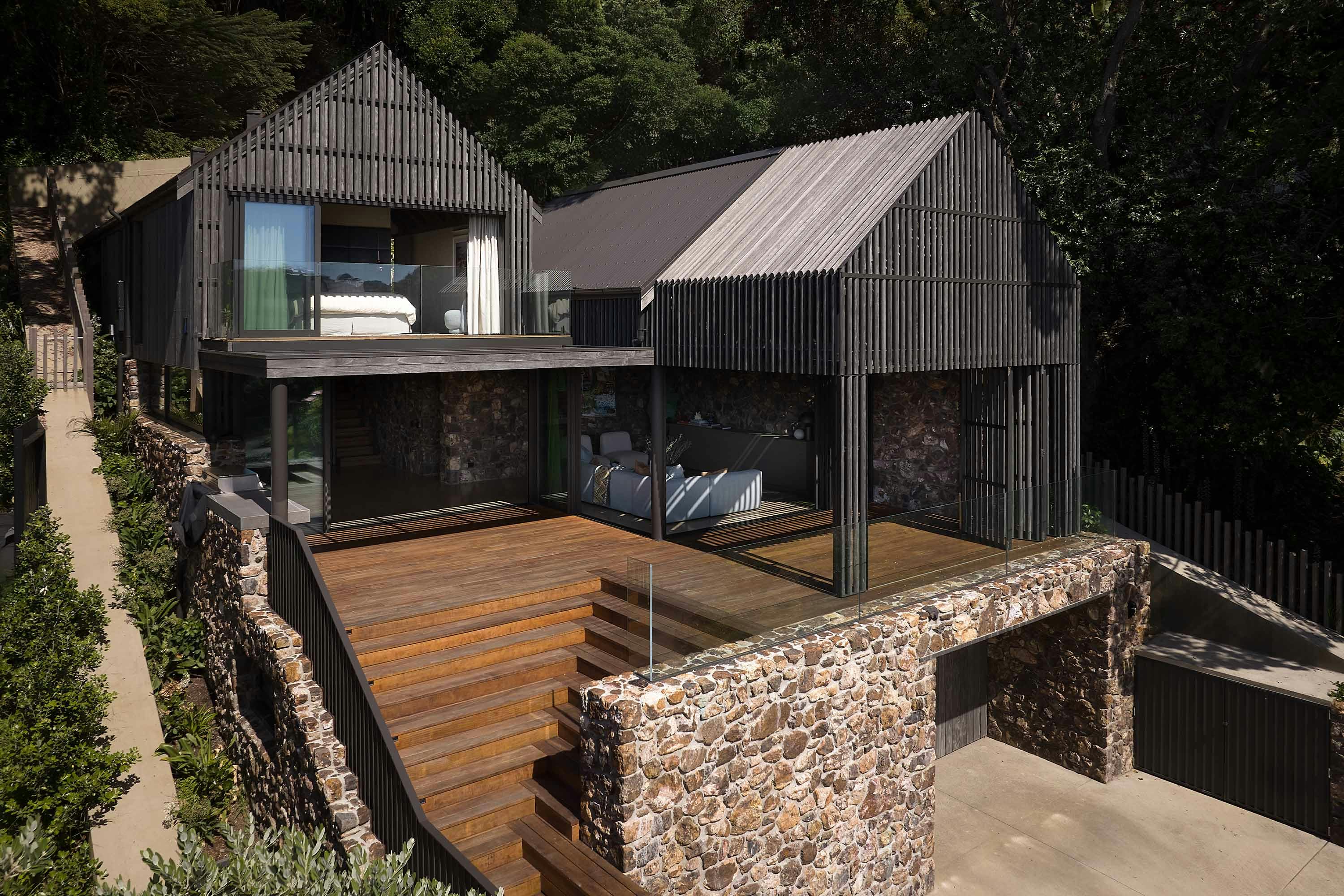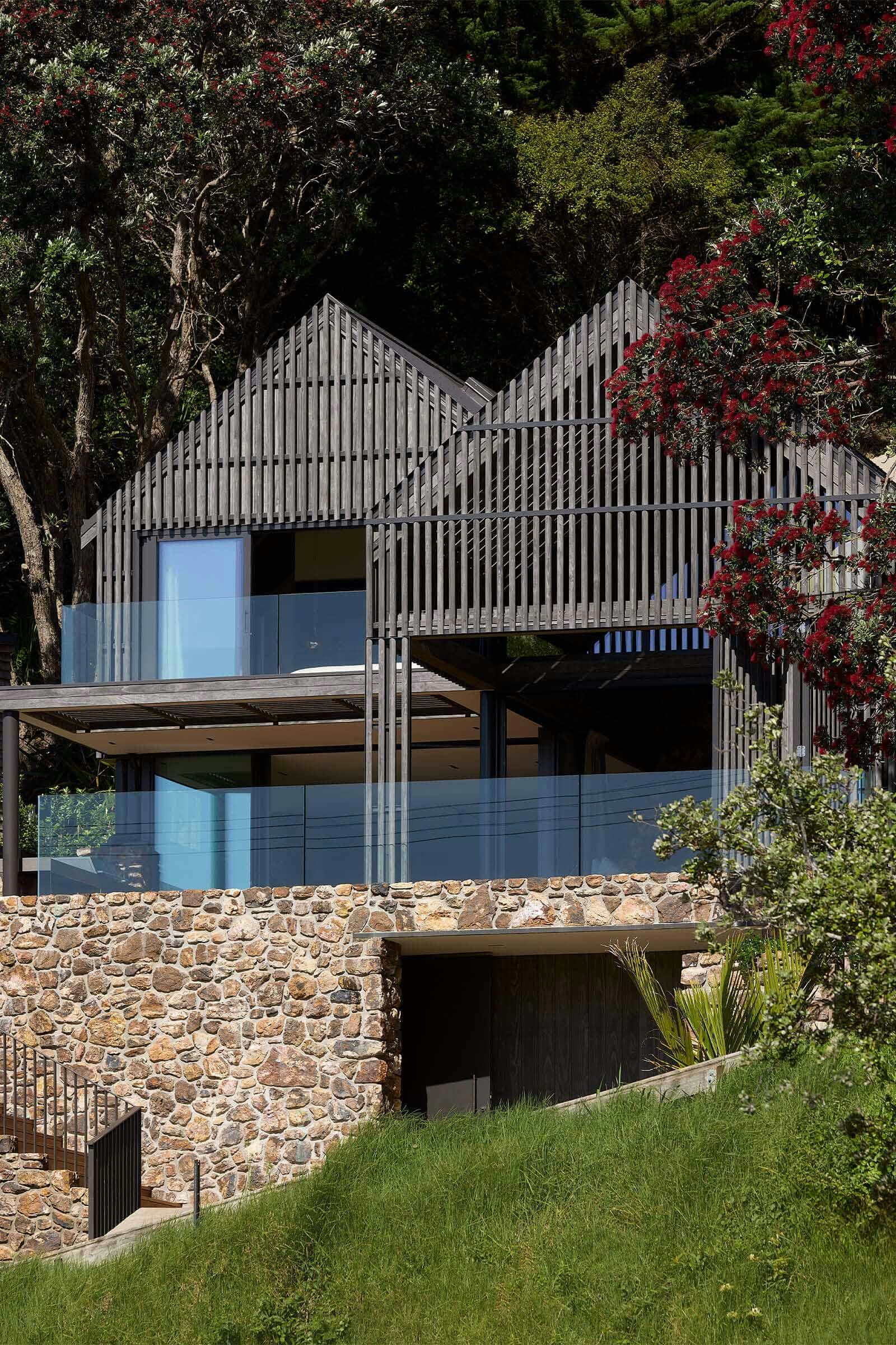 Tucked among Pōhutukawas, this 3-bedroom home combines natural materials, light-filled interiors and thoughtful detailing. Local stone clads the basement and rises along the façade, while Accoya slats and louvres filter light, provide natural ventilation, and offer privacy and shelter from sun and wind.