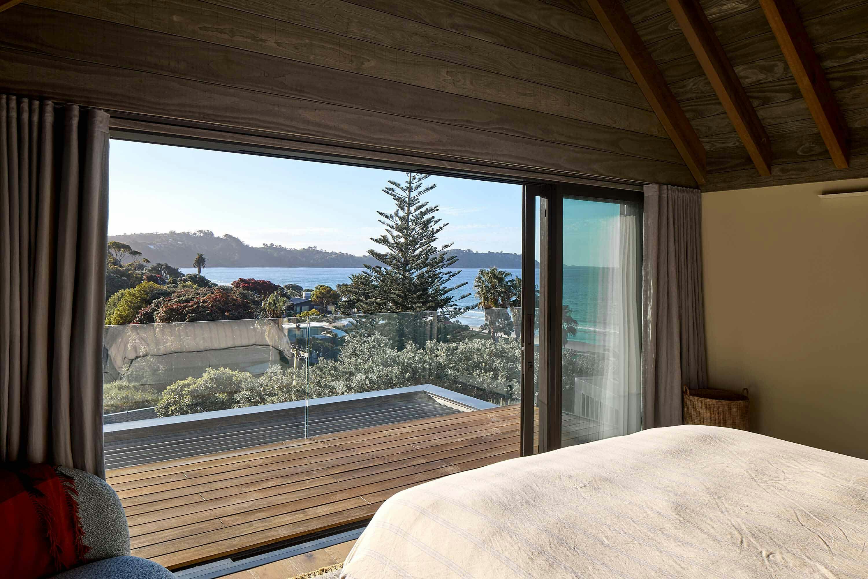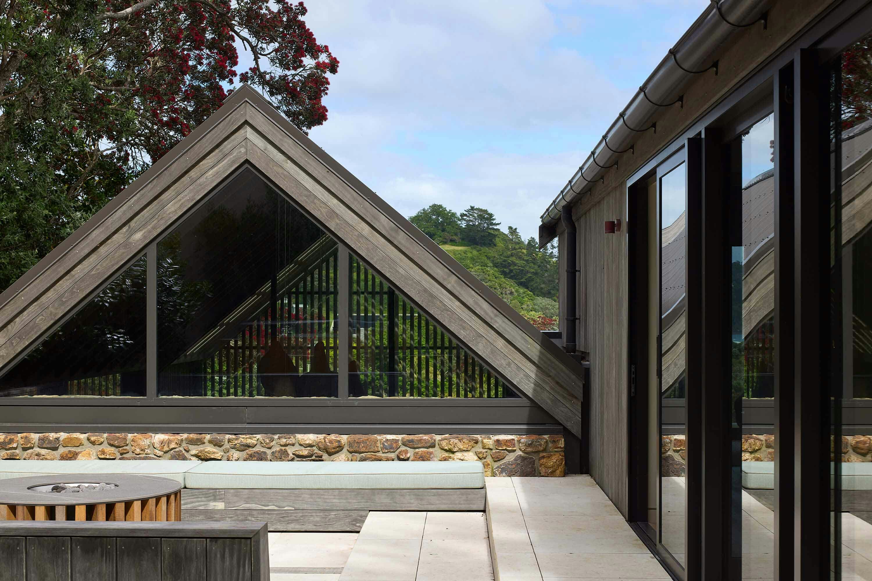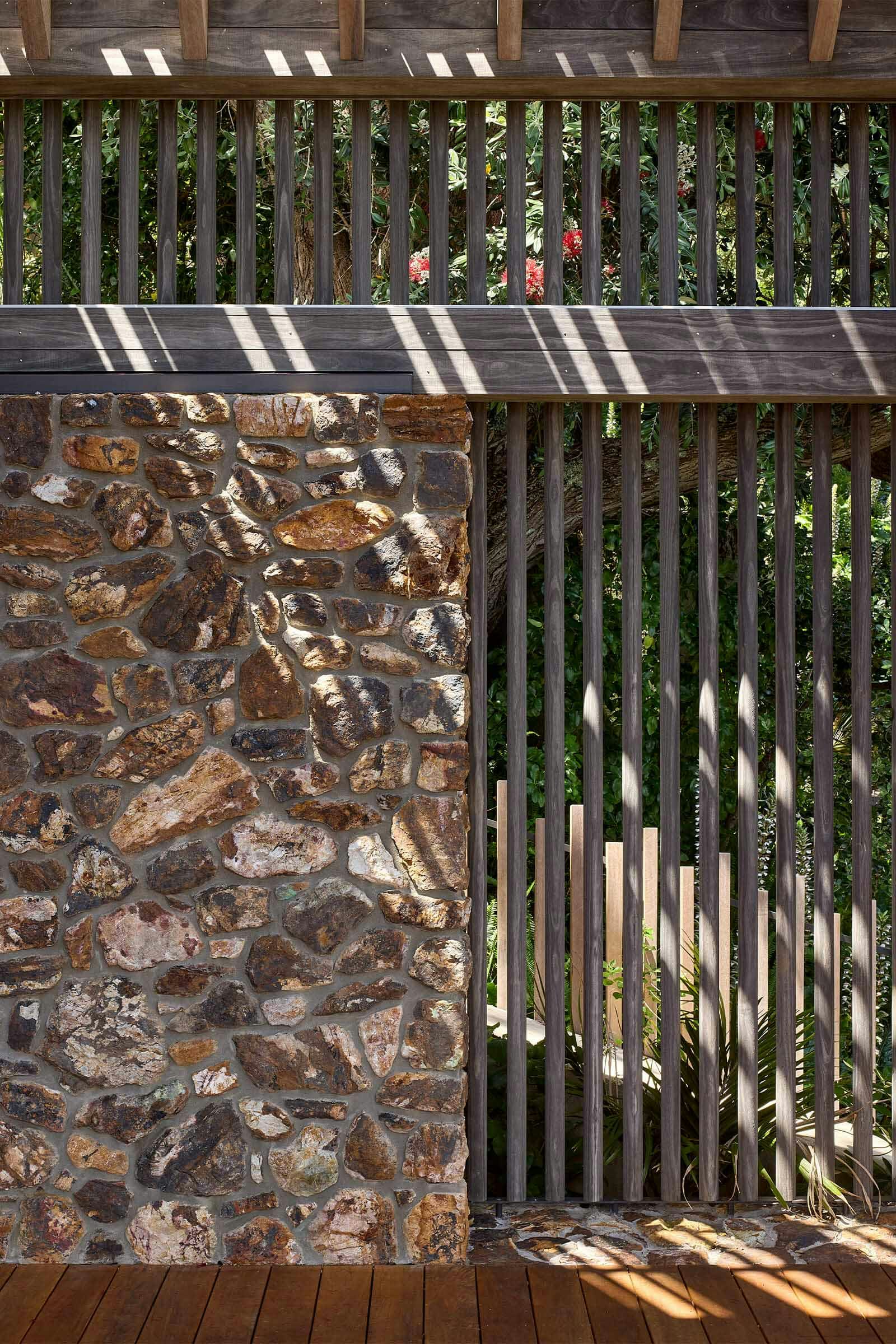 Tucked among Pōhutukawas, this 3-bedroom home combines natural materials, light-filled interiors and thoughtful detailing. Local stone clads the basement and rises along the façade, while Accoya slats and louvres filter light, provide natural ventilation, and offer privacy and shelter from sun and wind.