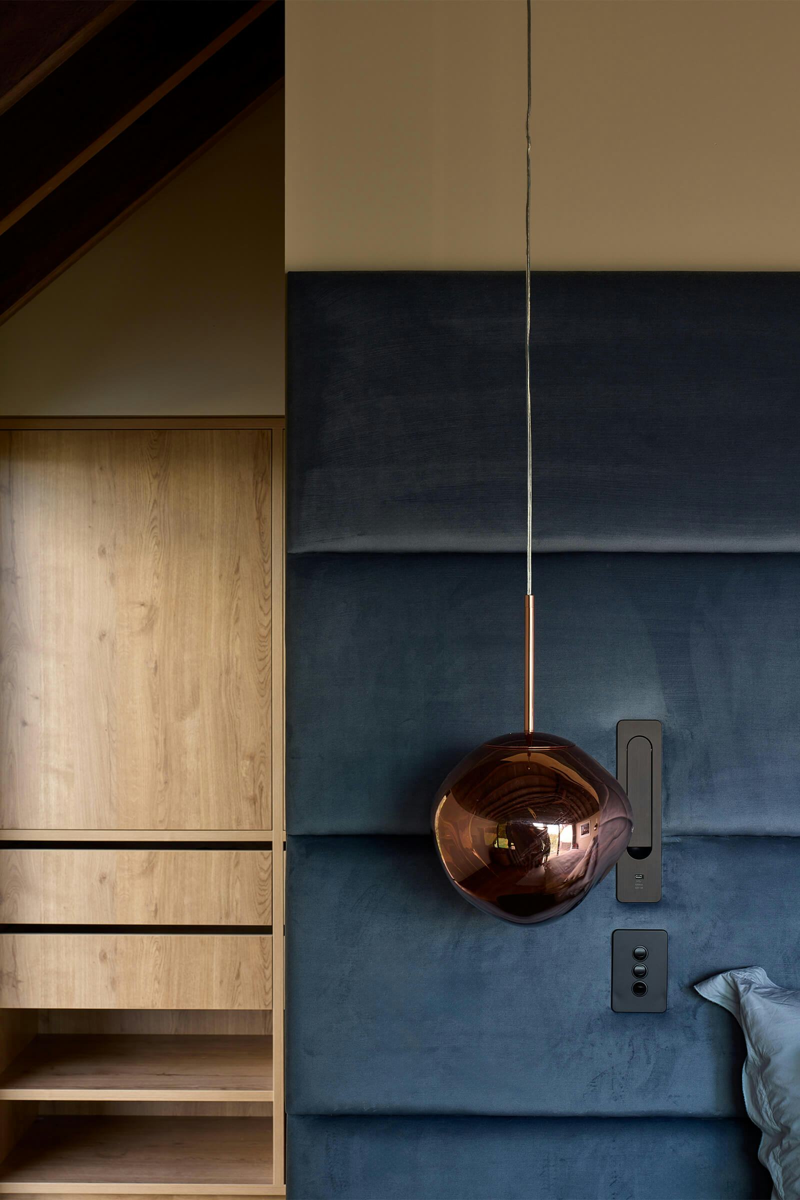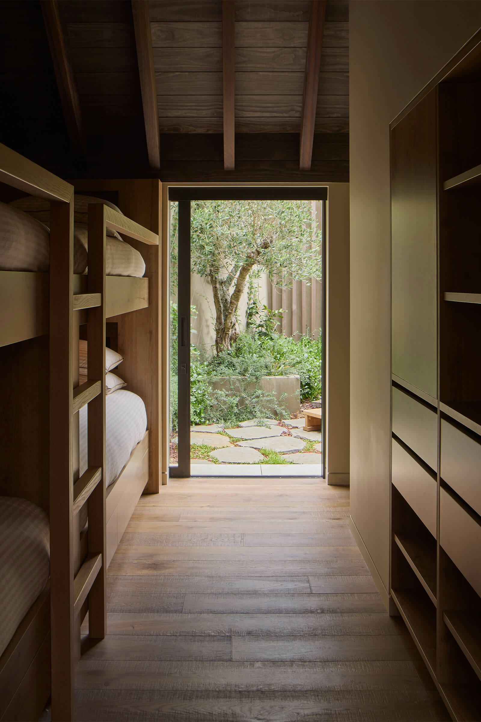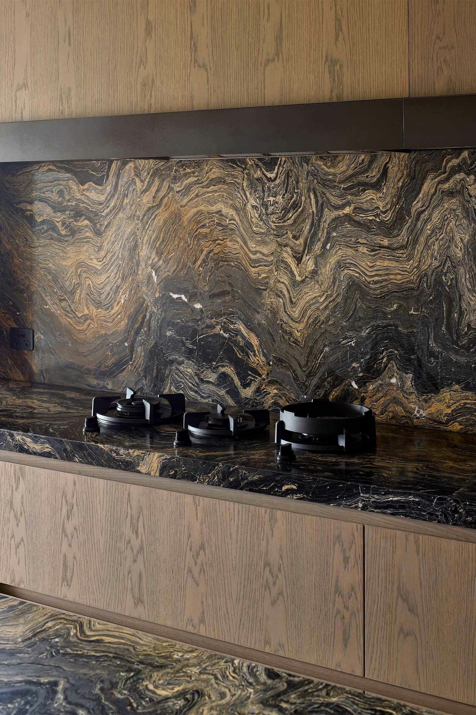 Timber veneer cabinetry and Nero Giallo marble benchtops define the kitchen, with a discreet scullery keeping back-of-house operations out of sight. Hydronic heated concrete floors and exposed Greenheart rafters add warmth and texture throughout.