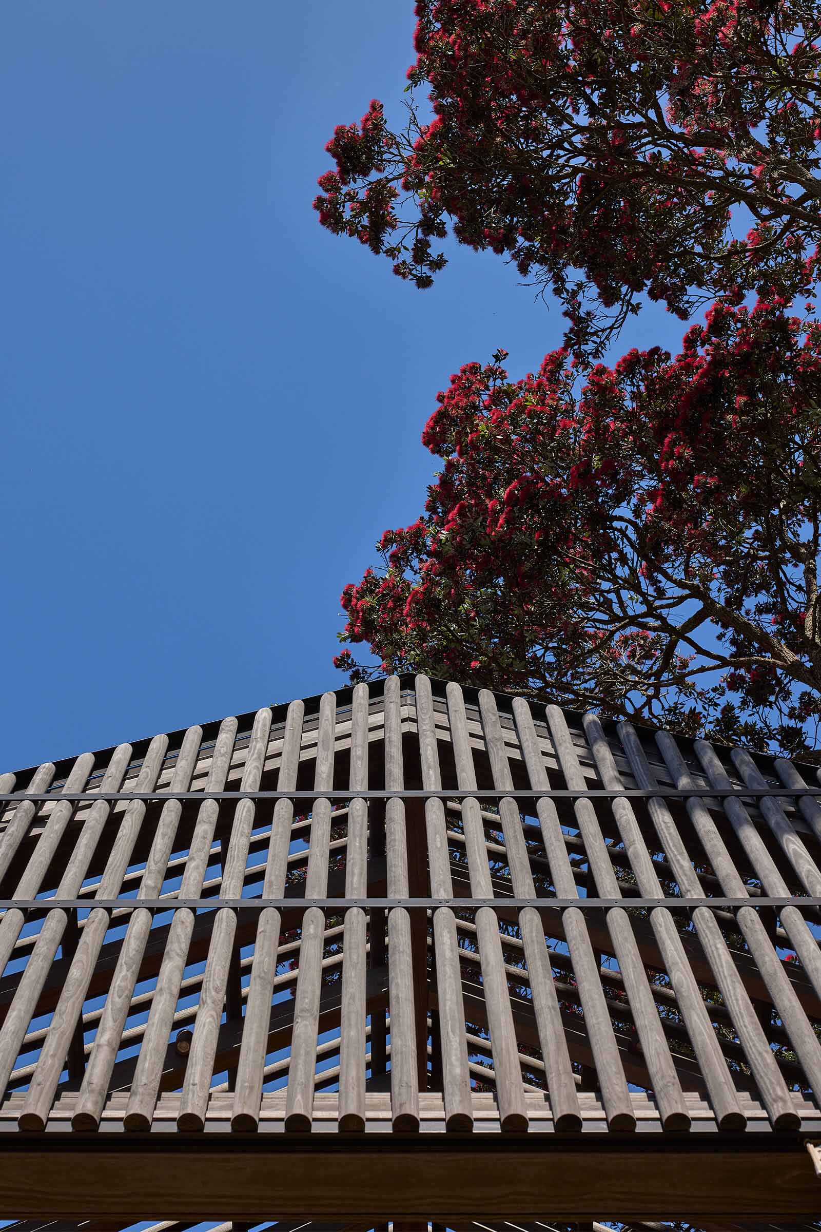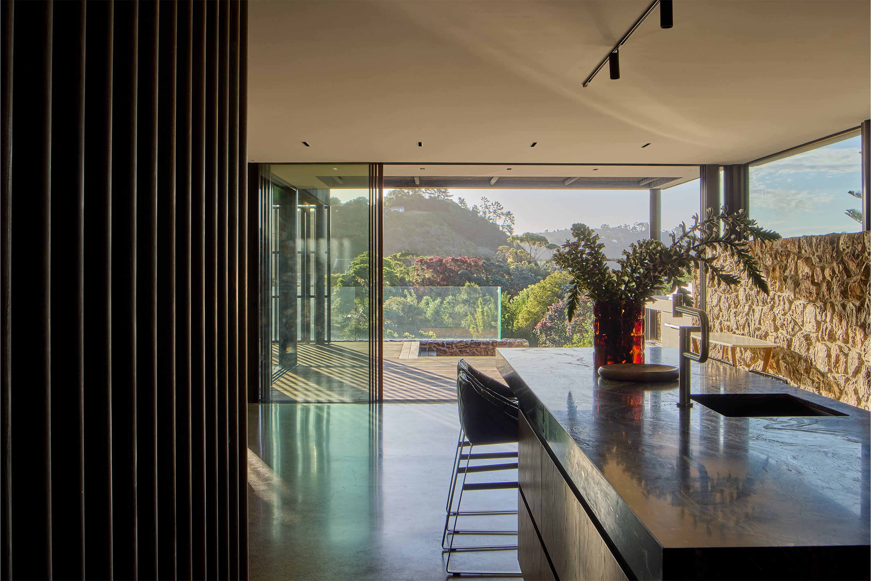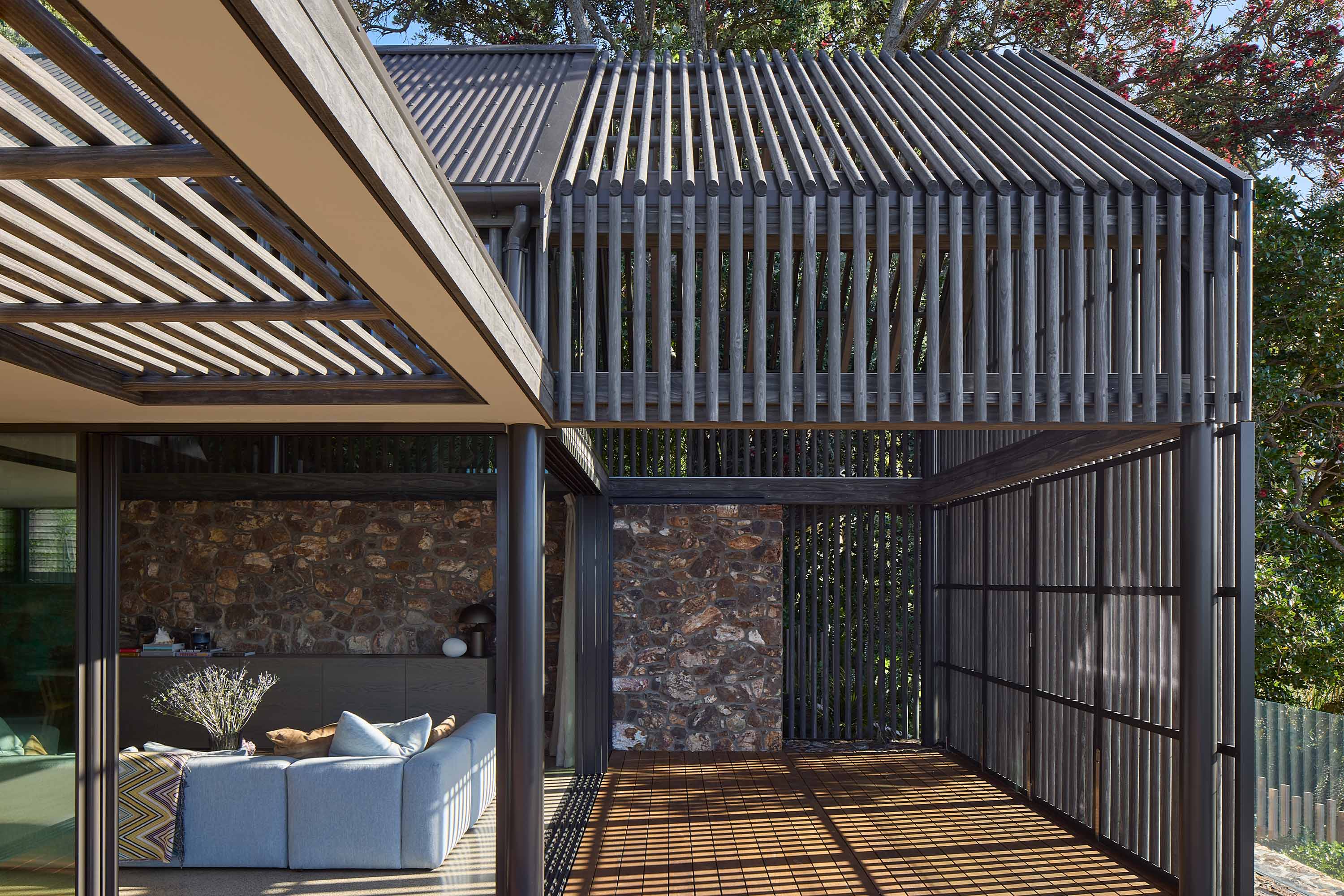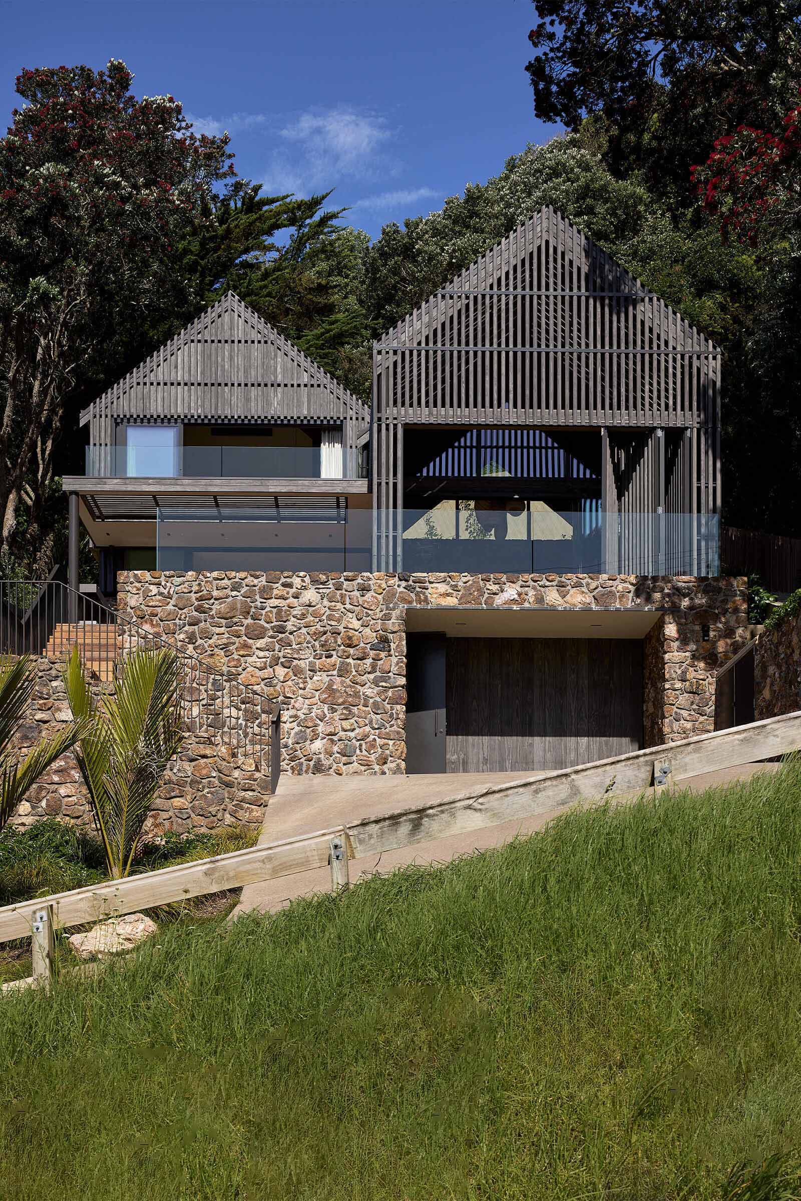 Tucked among Pōhutukawas, this 3-bedroom home combines natural materials, light-filled interiors and thoughtful detailing. Local stone clads the basement and rises along the façade, while Accoya slats and louvres filter light, provide natural ventilation, and offer privacy and shelter from sun and wind.