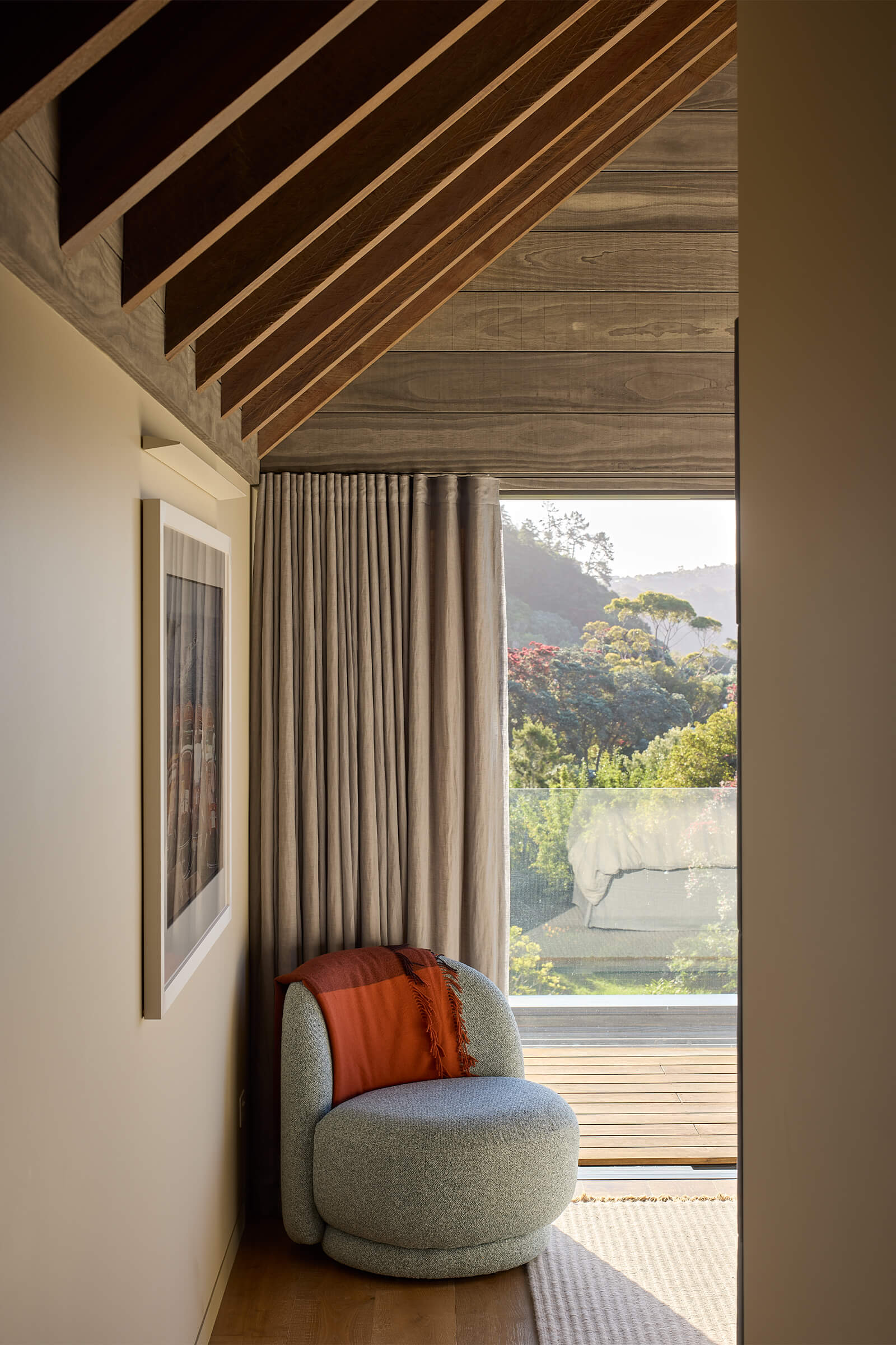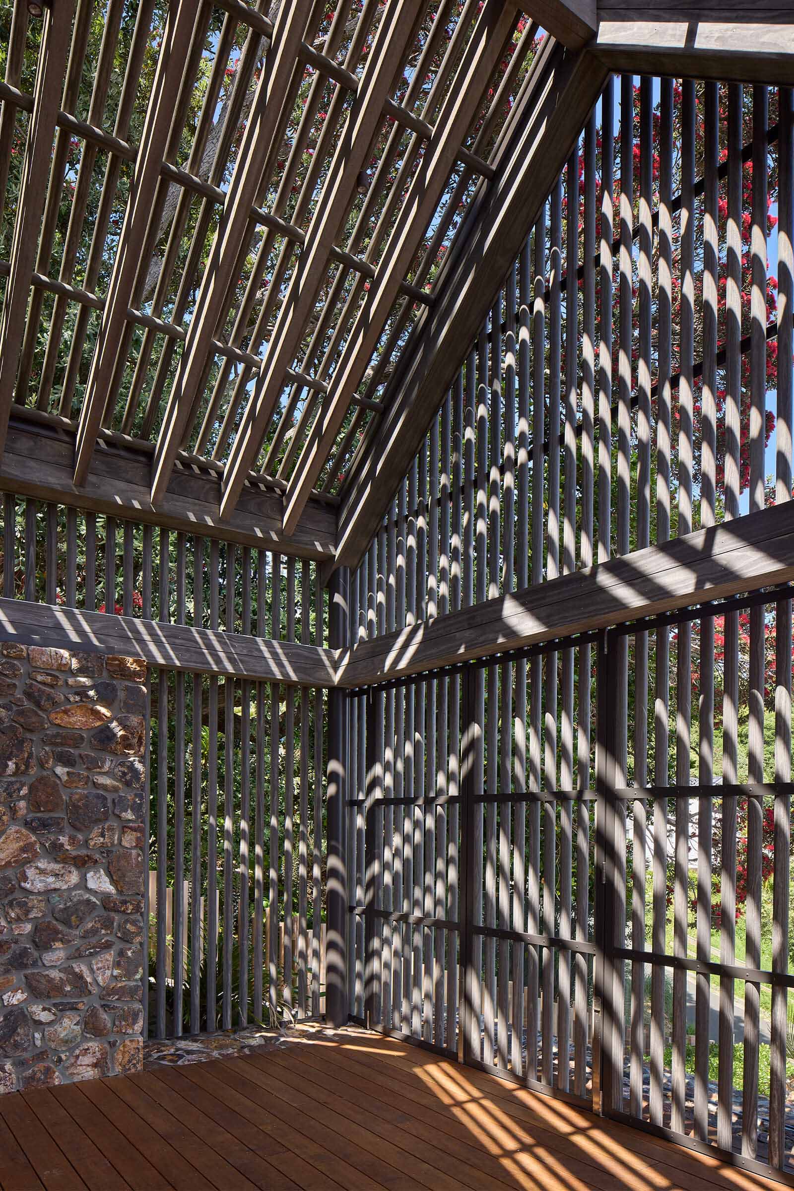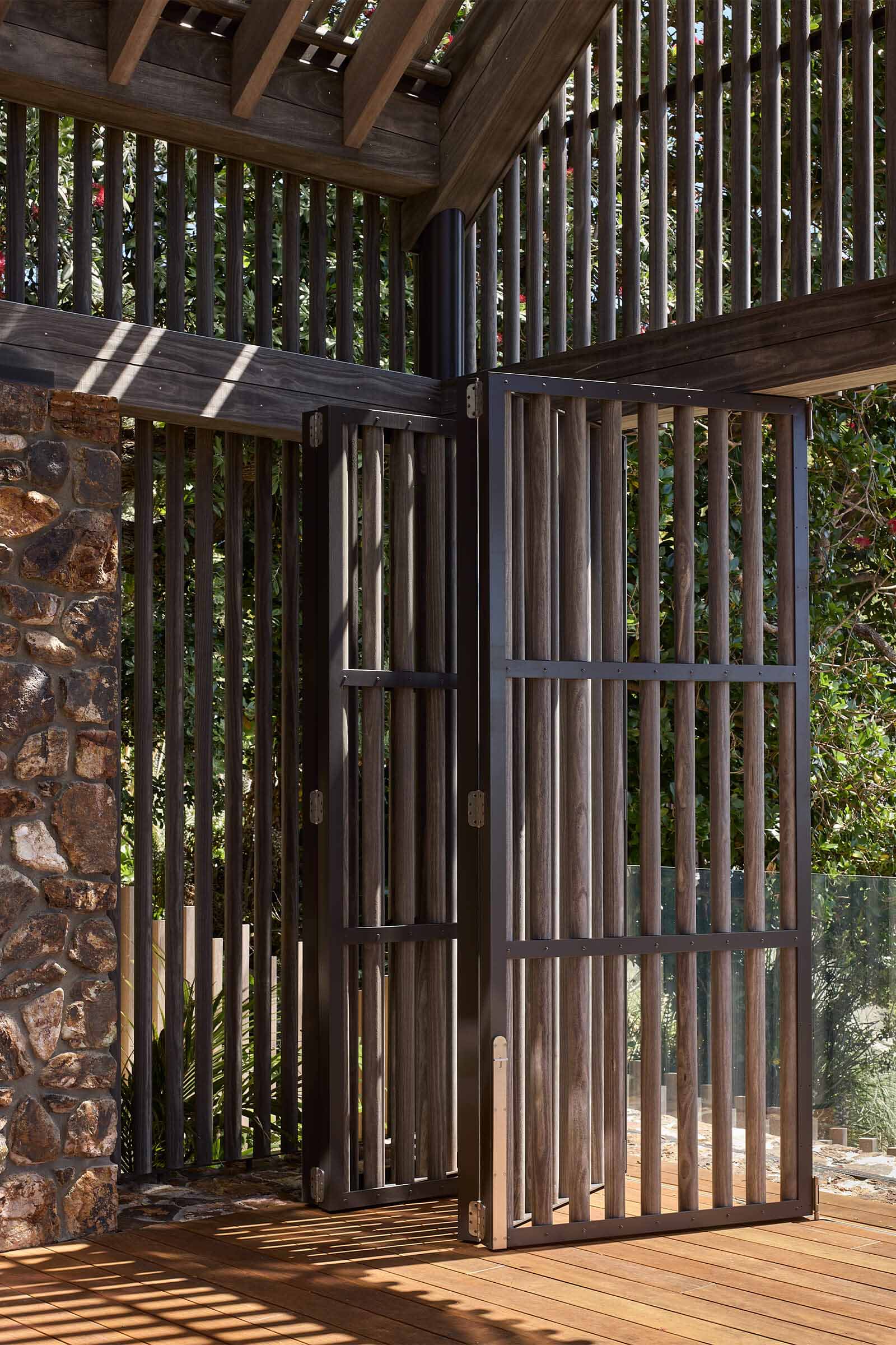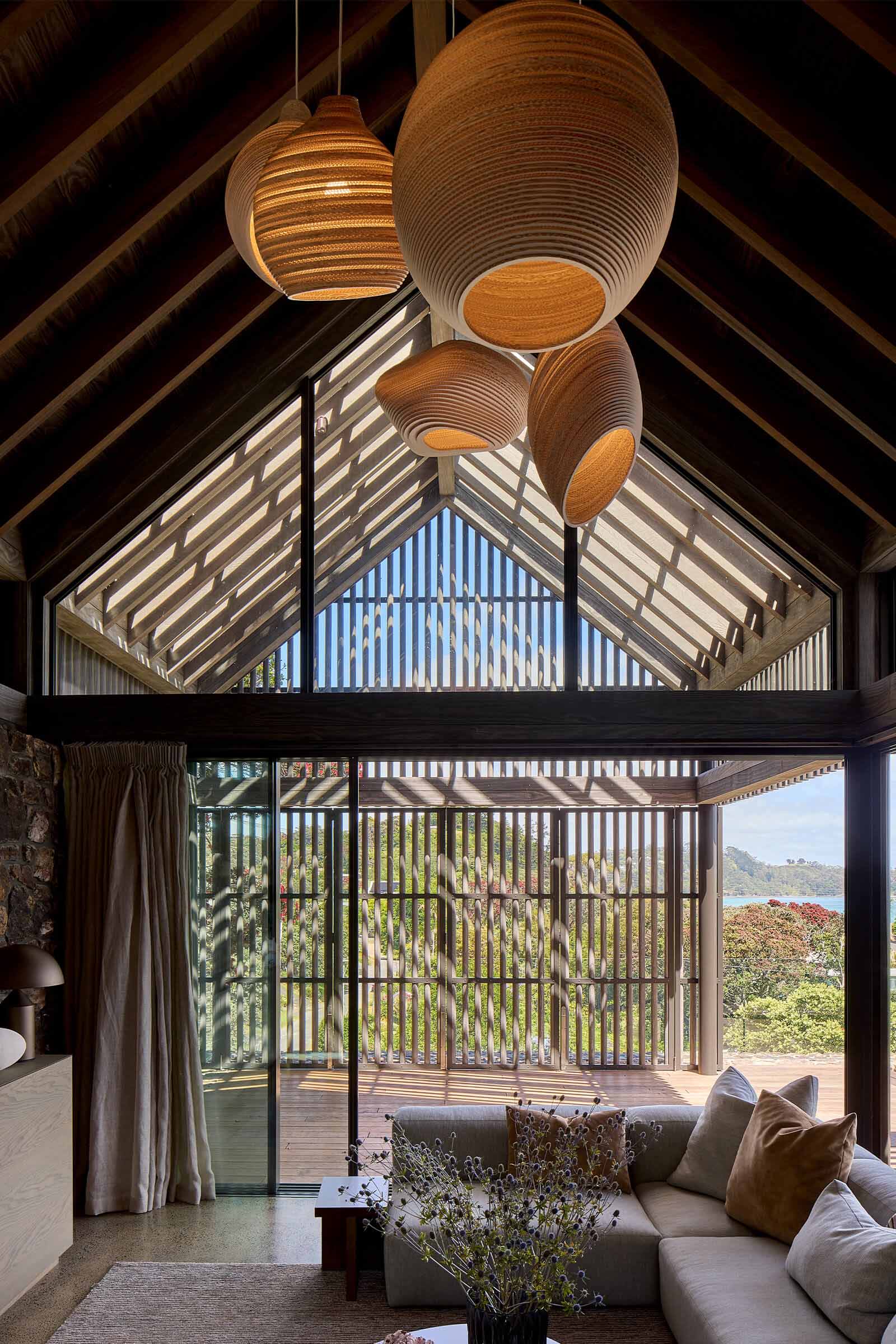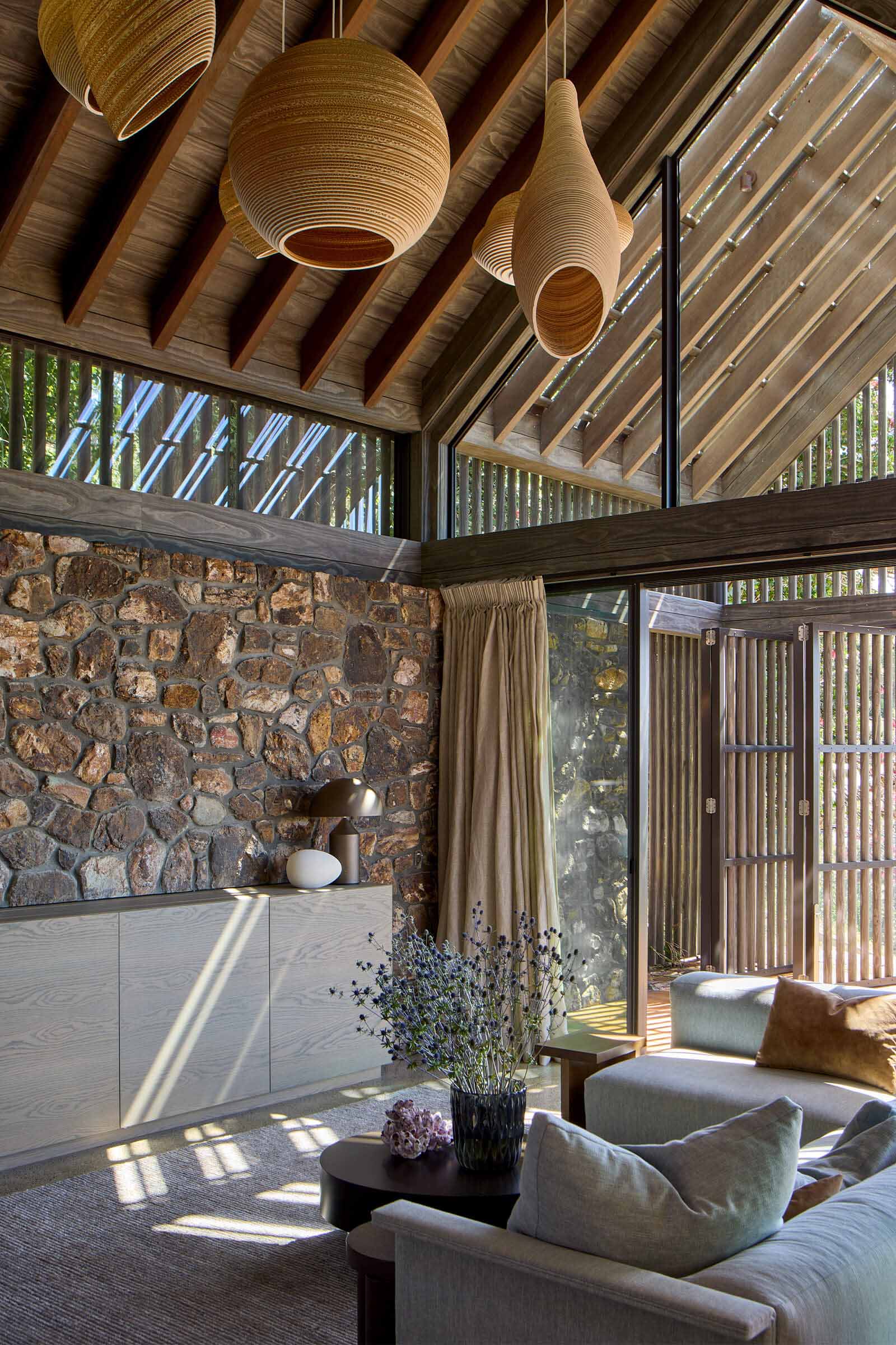 Tucked among Pōhutukawas, this 3-bedroom home combines natural materials, light-filled interiors and thoughtful detailing. Local stone clads the basement and rises along the façade, while Accoya slats and louvres filter light, provide natural ventilation, and offer privacy and shelter from sun and wind.