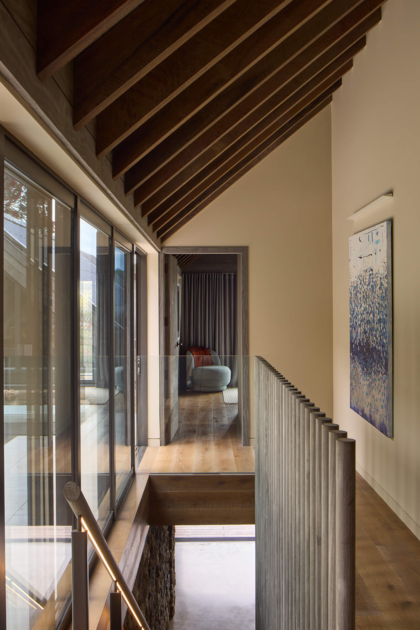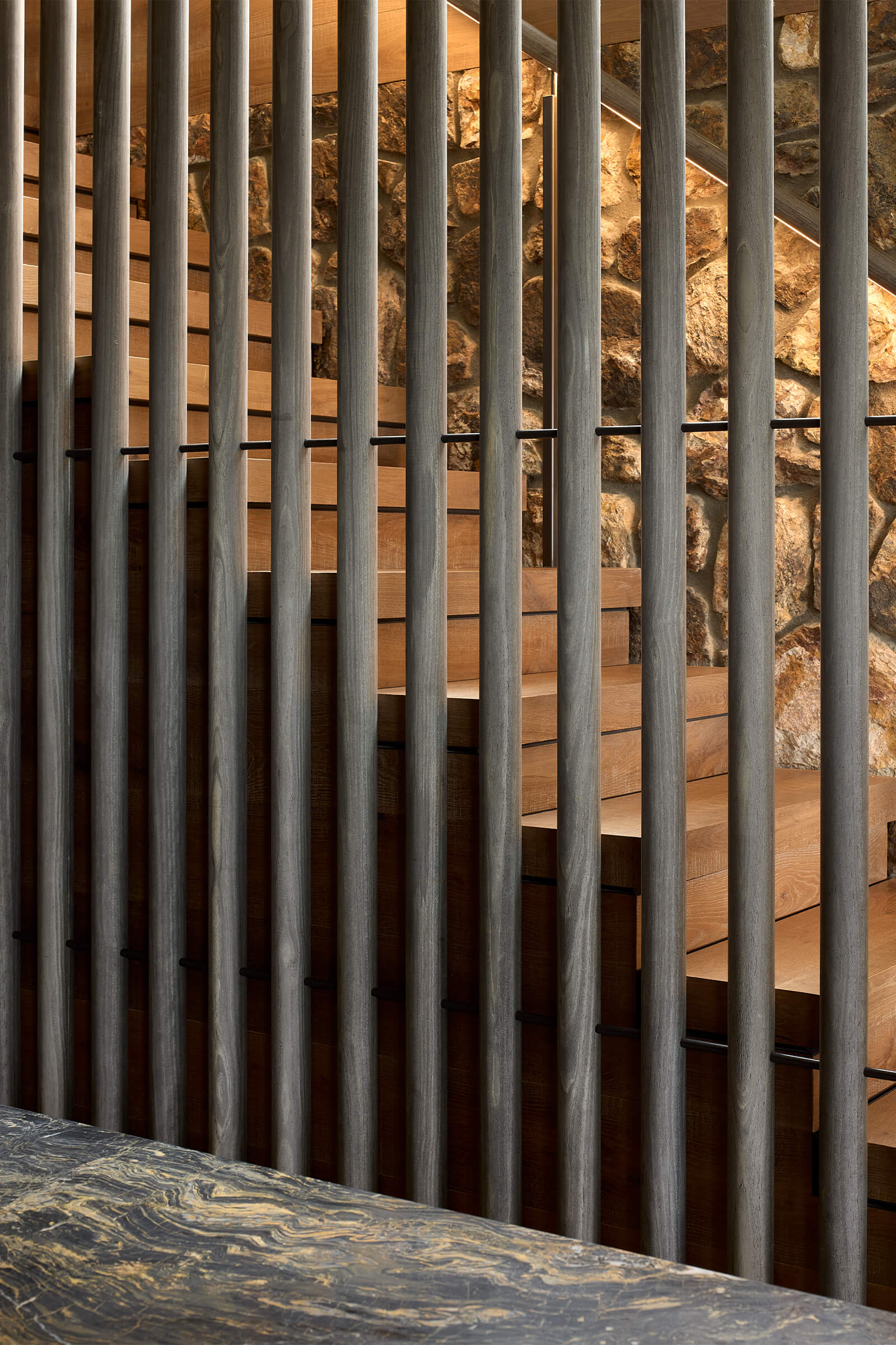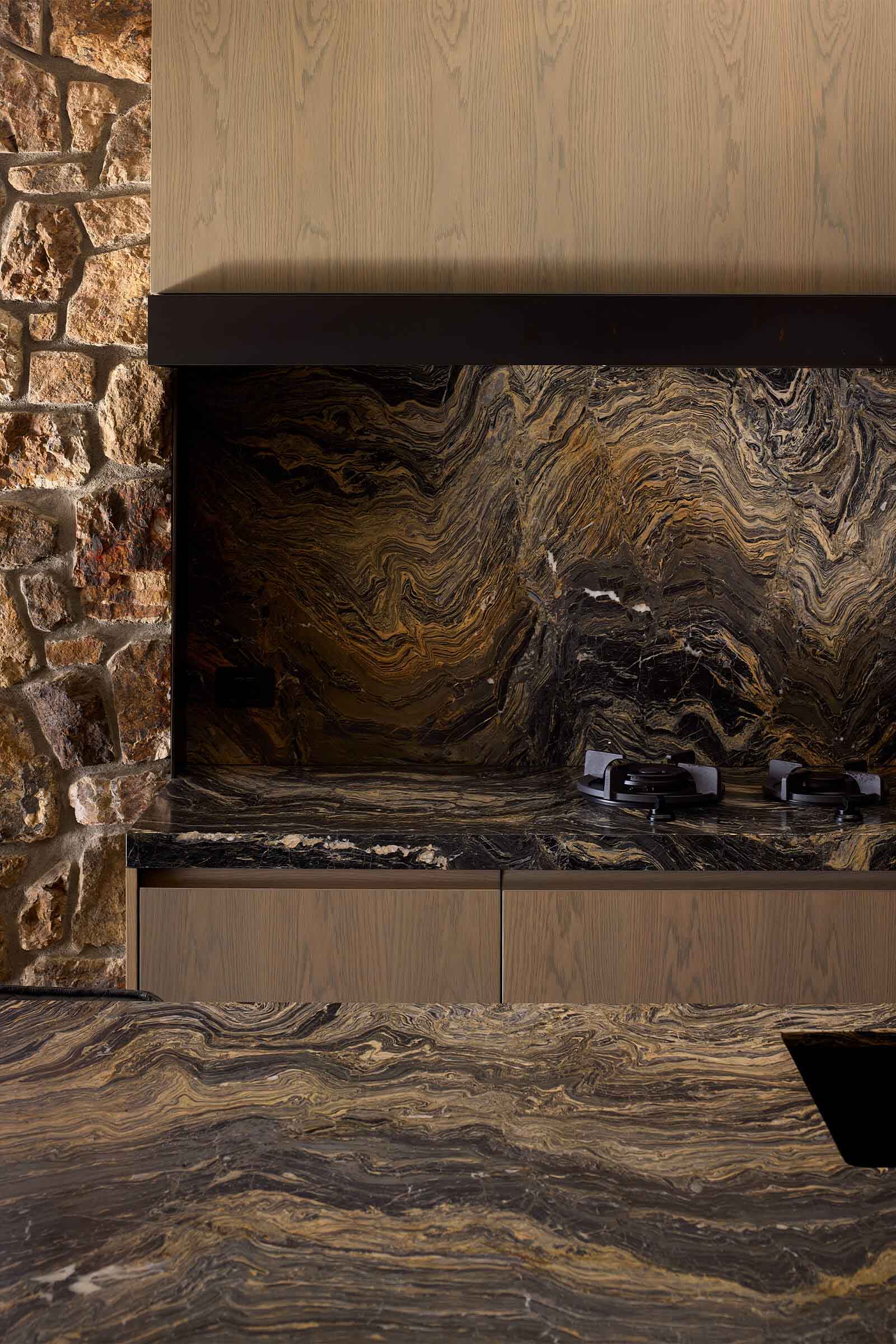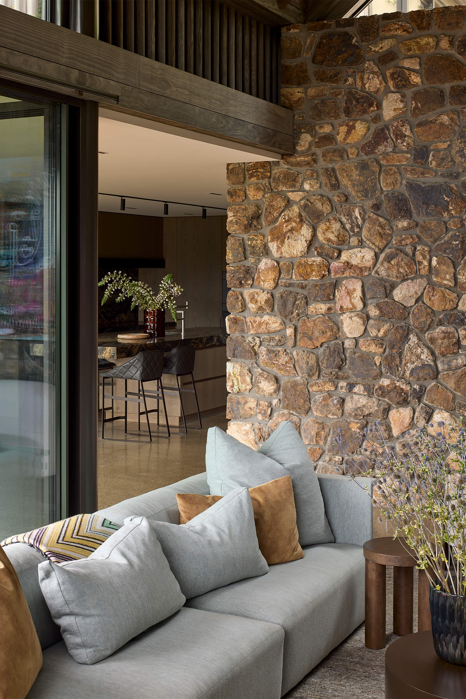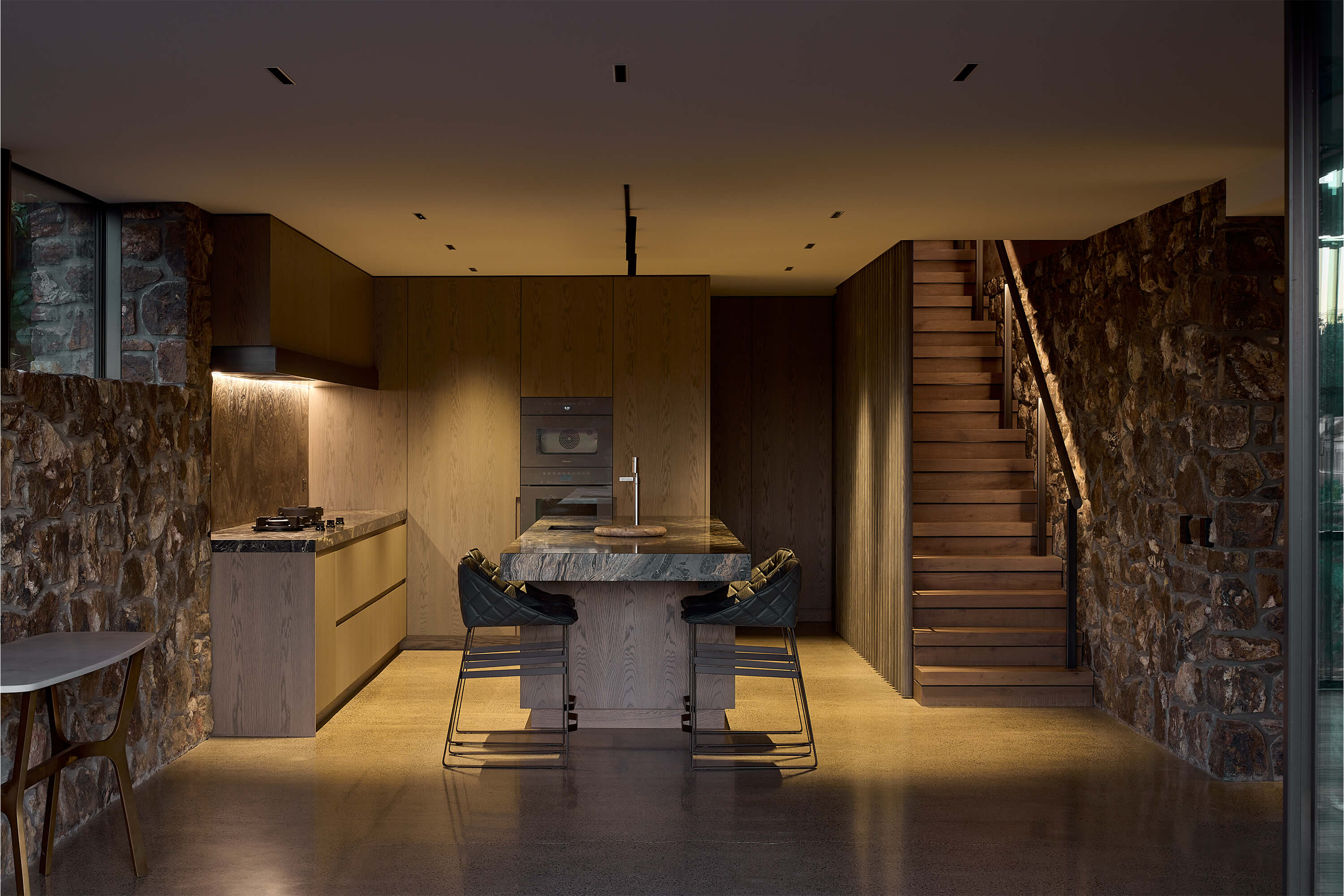 Timber veneer cabinetry and Nero Giallo marble benchtops define the kitchen, with a discreet scullery keeping back-of-house operations out of sight. Hydronic heated concrete floors and exposed Greenheart rafters add warmth and texture throughout.