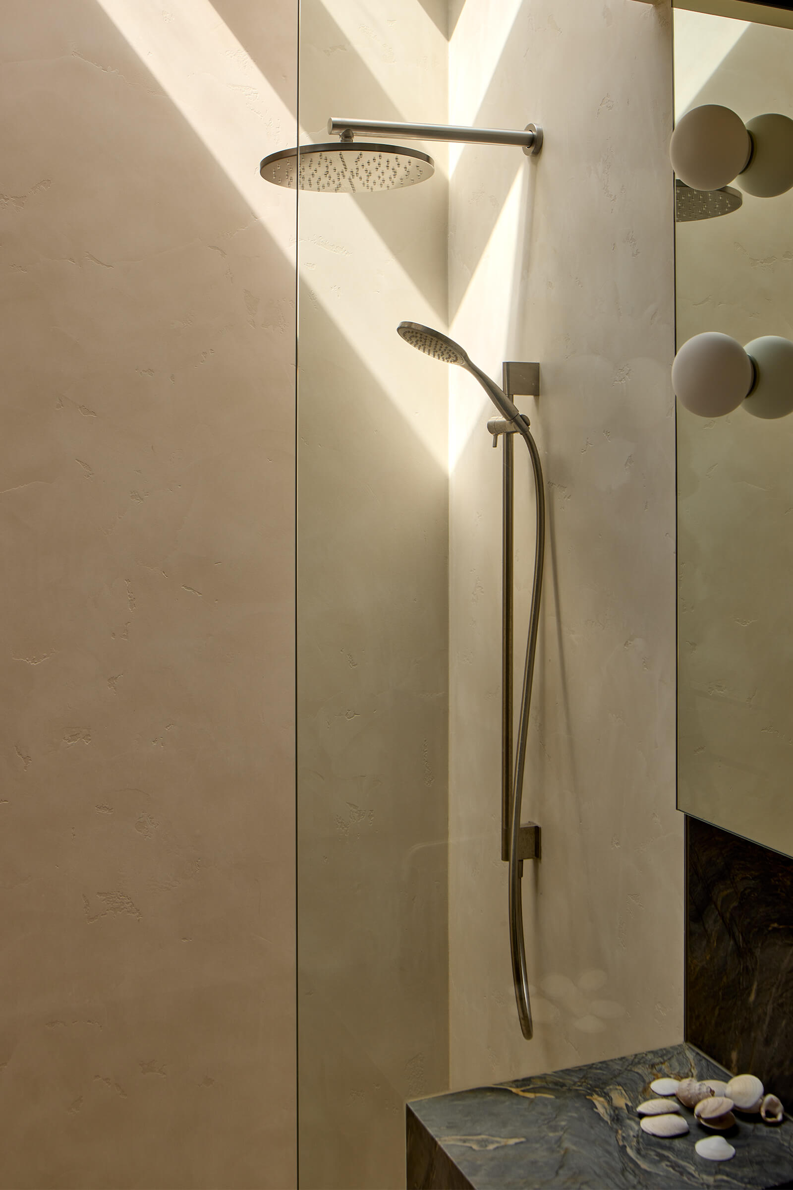 Upstairs, three bedrooms and bathrooms surround a private courtyard with spa. The master suite captures Onetangi Beach views, with a light-filled ensuite featuring a marble vanity, microcement walls, and skylit open shower.